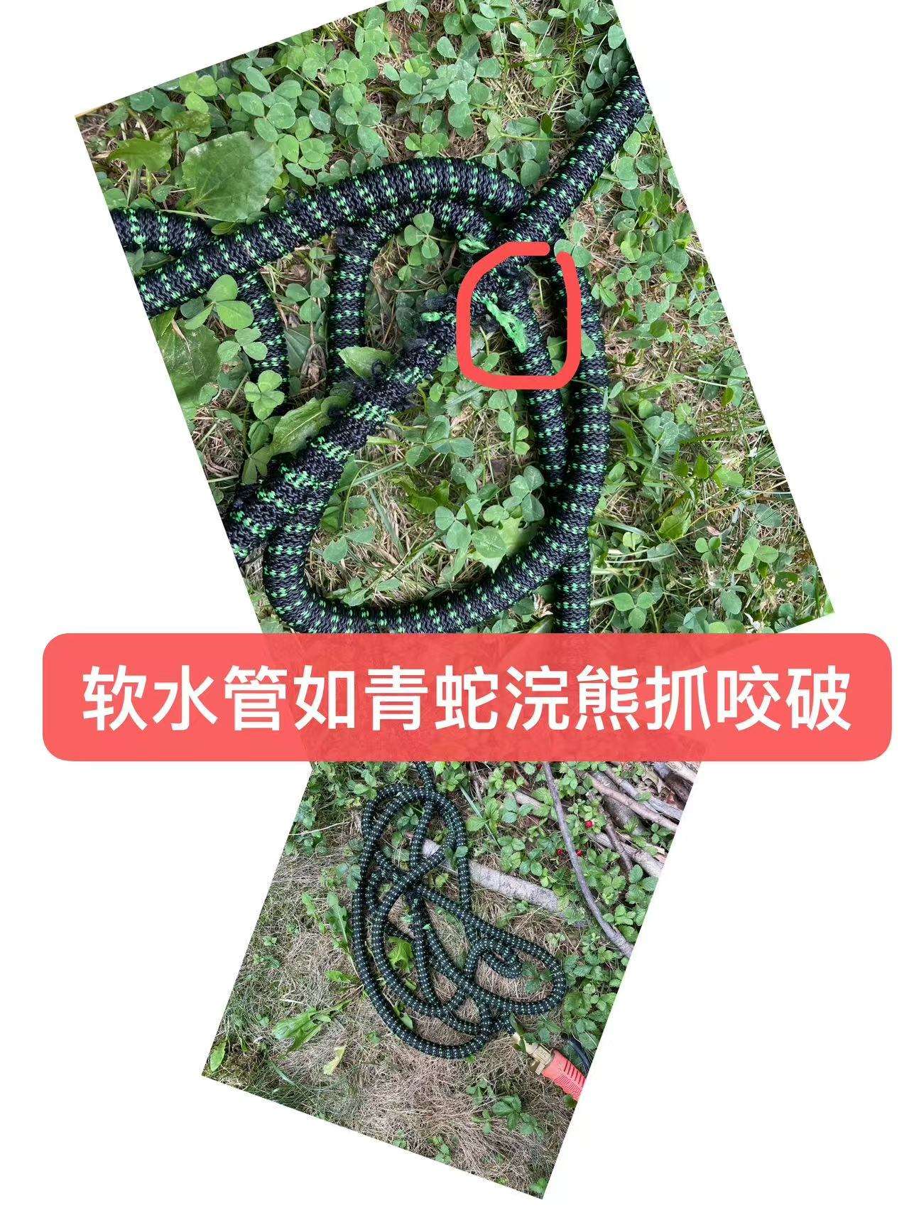 浣熊那晚还抓破软水管子,因我没关总开关,放了一夜水。这根青黑交织的软管,儿子去年买来为让我使用轻便些,当时我一看就说很吓人,像条青蛇。今年拿出来使用后就一直放在草地。 有天傍晚,儿子从车库进来吓一大跳,说要盘绕起来放, 以后放完水就盘着放。心想熊为什么把软管抓破,它与我们一样把水管误认为是蛇了,可抓破的不是蛇肉,而放出来的是凉水,比茭白桶的泥水干净又清爽,洗它的爪子,越洗越锋利,在茭白和自来水之间开心地玩了一夜,还留下让我作对比证据。儿子安慰别心疼水了,就当浇草地,对种的黄瓜丝瓜也吸了水,但你也不能百分之百肯定是浣熊,只可说百分之九十五,要么给你买个笼子来,放它进来的洞口。我说不,不能再让它进来了,今年茭白已受伤过三次,也让我明白植物也有顽强的生命力,每次绿叶倒地,给它扶植,用布条包扎,那片断了半根的叶子,照样绿油油地往上长,去年一根黄瓜和南瓜藤弄裂半截,用布包梱后照样开花结果,朋友说我是植物的接骨医生了。