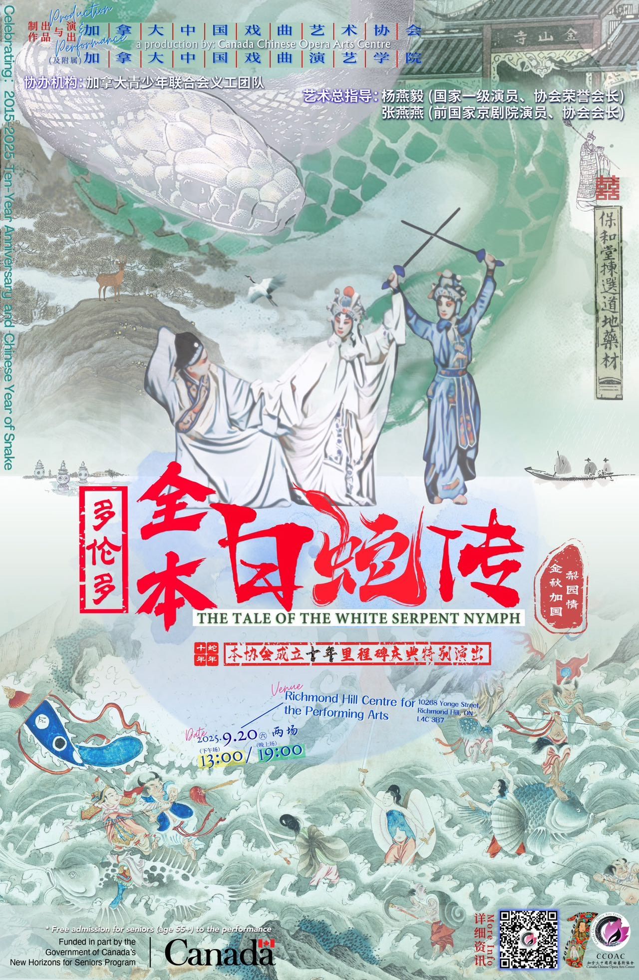 十年,蛇年,又一年。从2015年秋到2025年秋,加拿大中国戏曲艺术协会成立10年了。为了庆祝这一里程碑,也为了配合“蛇年”的主题,加拿大中国戏曲艺术协会将在今年的「天涯共此时·金秋加国梨园情」年度系列推出庆典特别演出----2场全本京剧《白蛇传》。