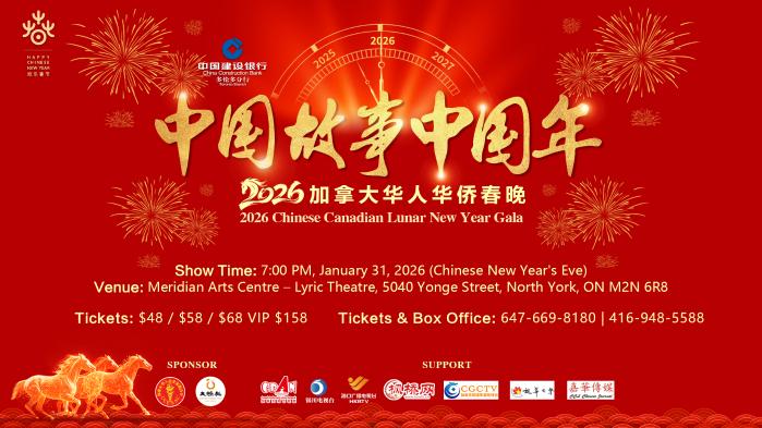 2026《中国故事·中国年》加拿大华侨华人春晚将于2026年1月31日(星期六)晚7:00在多伦多Meridian Arts Centre(Lyric Theatre----5040Yonge Street,Toronto)上演。