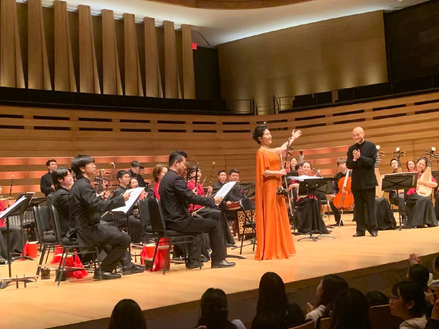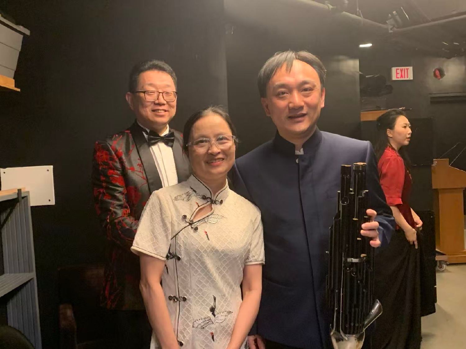 多伦多音乐学院院长何晓梅和笙演奏家王磊,背后是主持人洋溢
