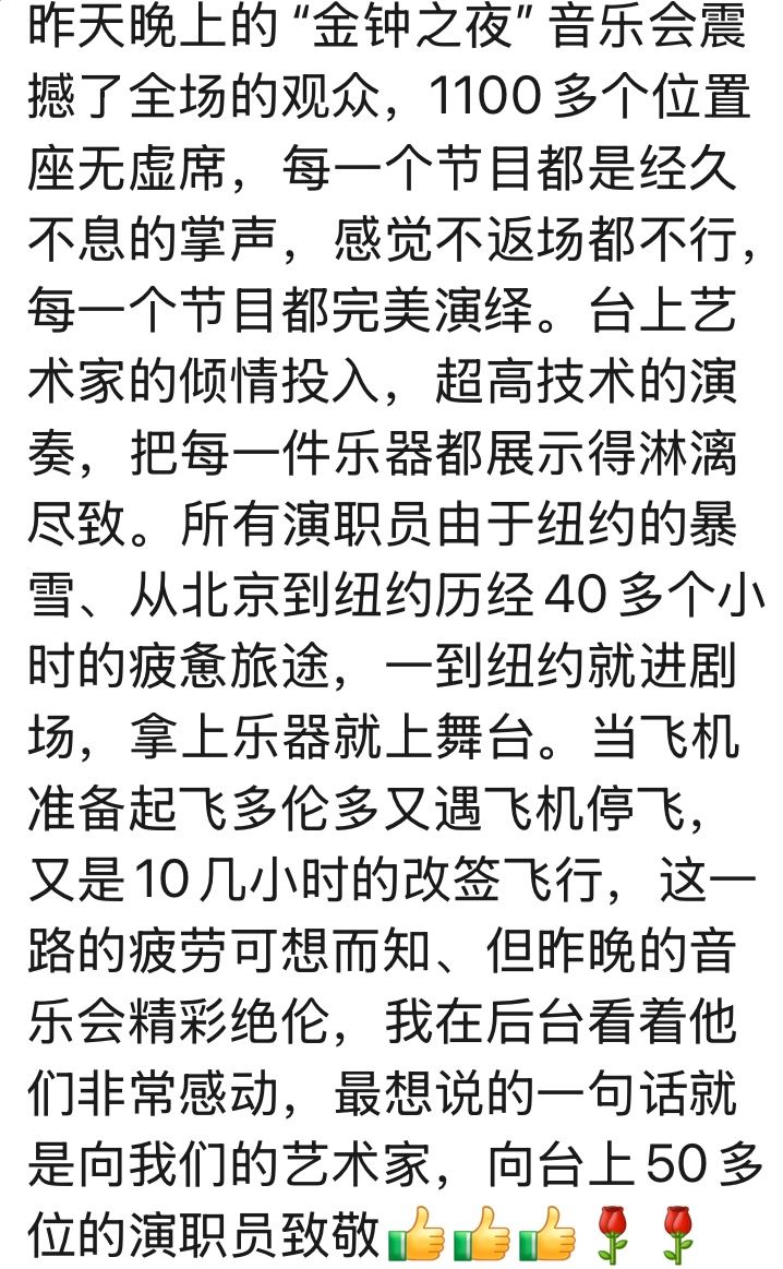 这台2026欢乐春节“金钟之星”中国新年音乐会,带给多伦多观众中华民乐震撼,深感民乐艺术之美。现场掌声经久不息,有观众表示:“在民乐声中开启新春,