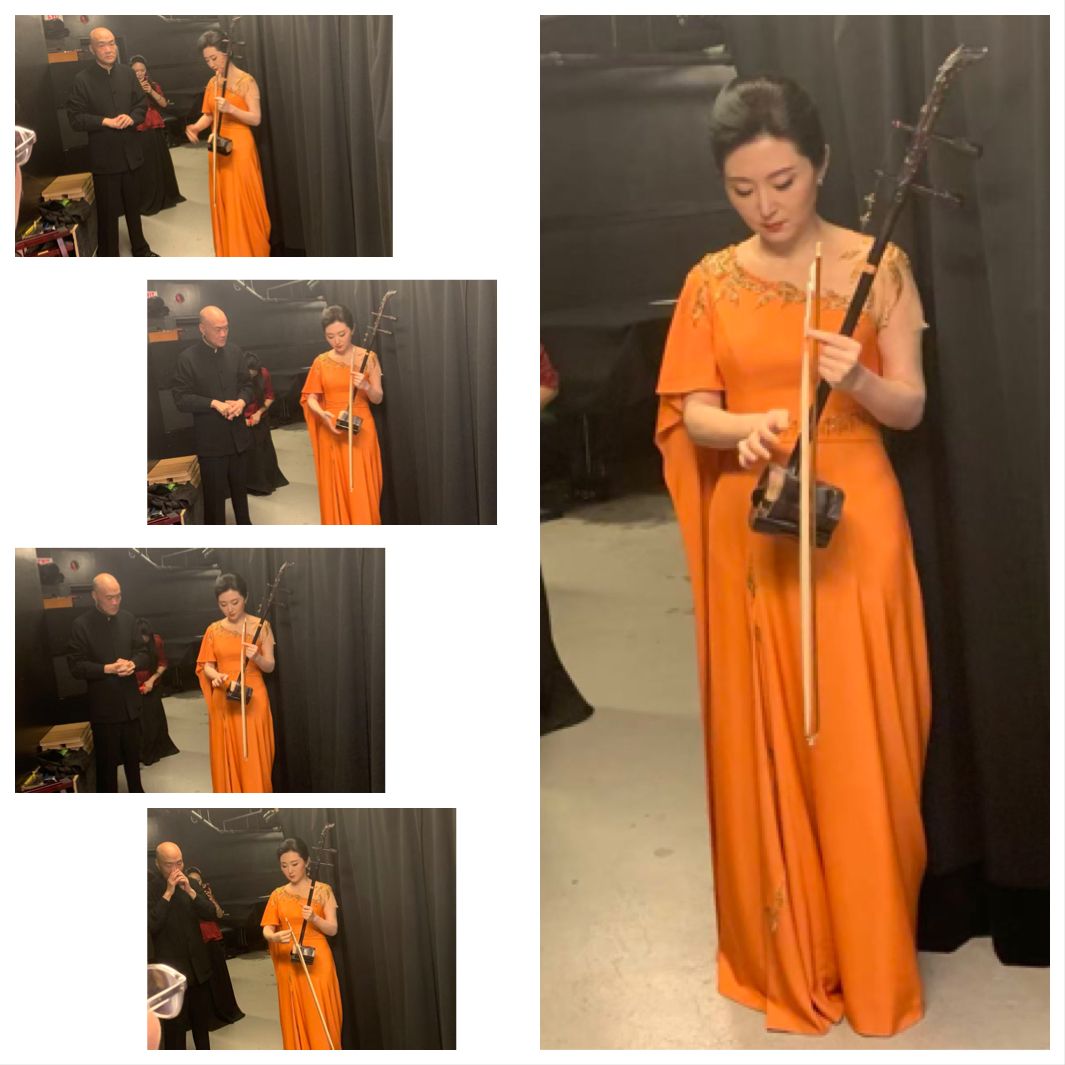 后台, 二胡演奏家于红梅上台前精心检查二胡不要有任何差错。