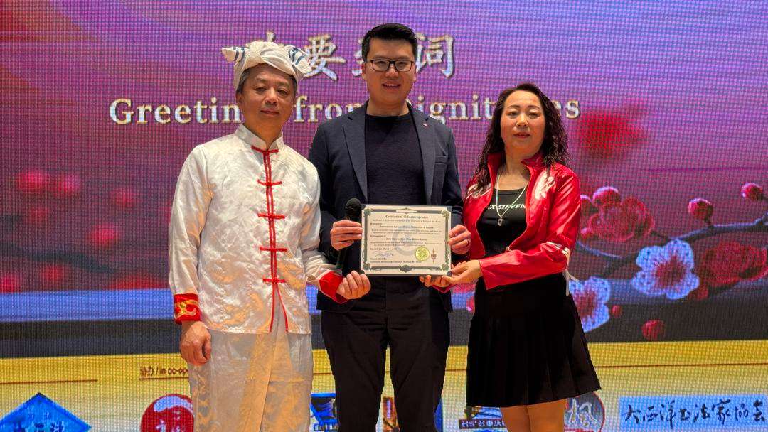 书法表演环节,大西洋书法家协会芮家庆现场挥毫,笔走龙蛇,