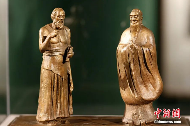 中国美术馆拍摄的《神遇-孔子与苏格拉底的对话》雕塑。(图片来源:中新网)