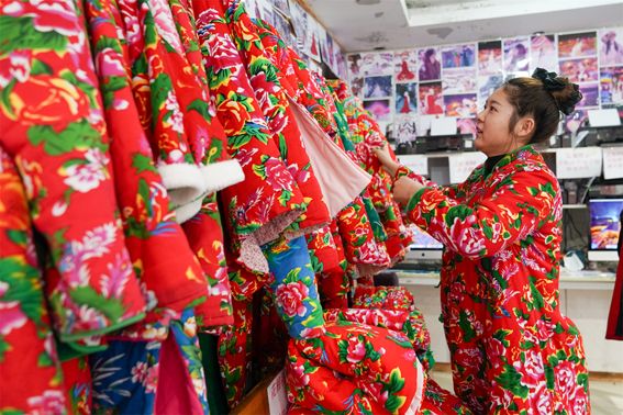 近日,雪乡旅拍向游客提供东北大花布棉袄。(图片来源:中新社)