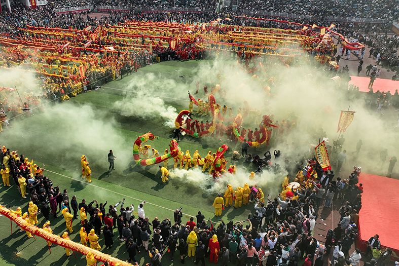 2月20日,中国农历正月十一,贵州省铜仁市石阡县体育场,唢呐声、击鼓声、敲锣声不断,78条毛龙上下左右翻滚,一会儿蛟龙出海、懒龙翻身,一会儿腾云驾雾、盘龙对峙,为民众和游客带来一场精彩的“群龙出海”表演。