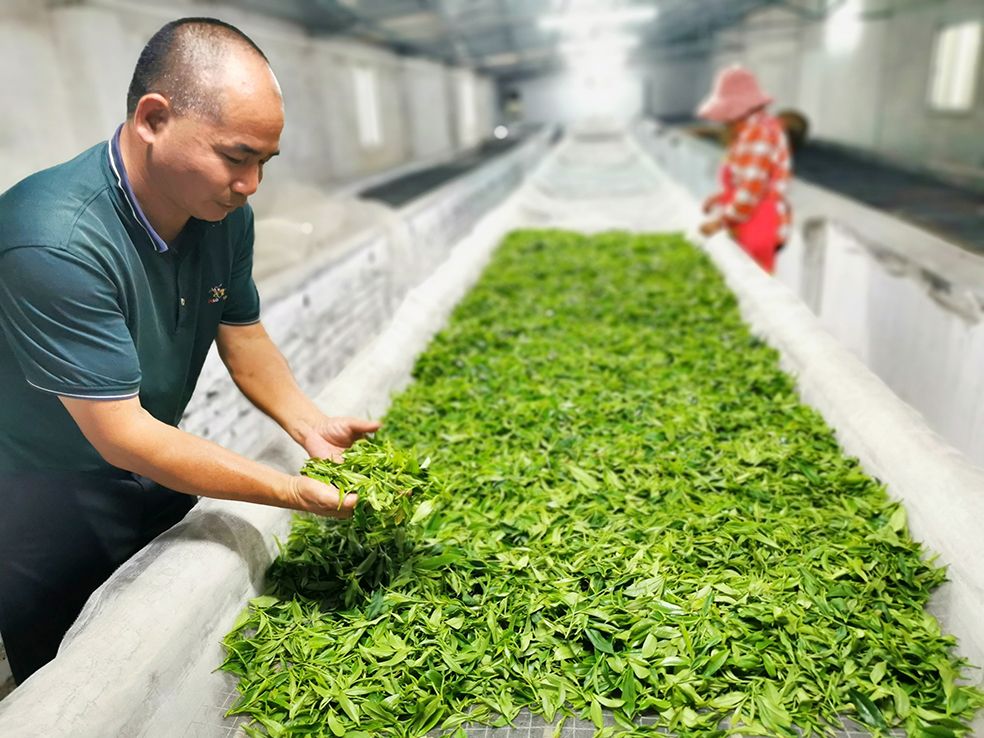 4月8日,台山市上川岛某茶叶公司负责人盘卫林在查看新鲜采到的白云茶茶青。(图片来源:中新社)