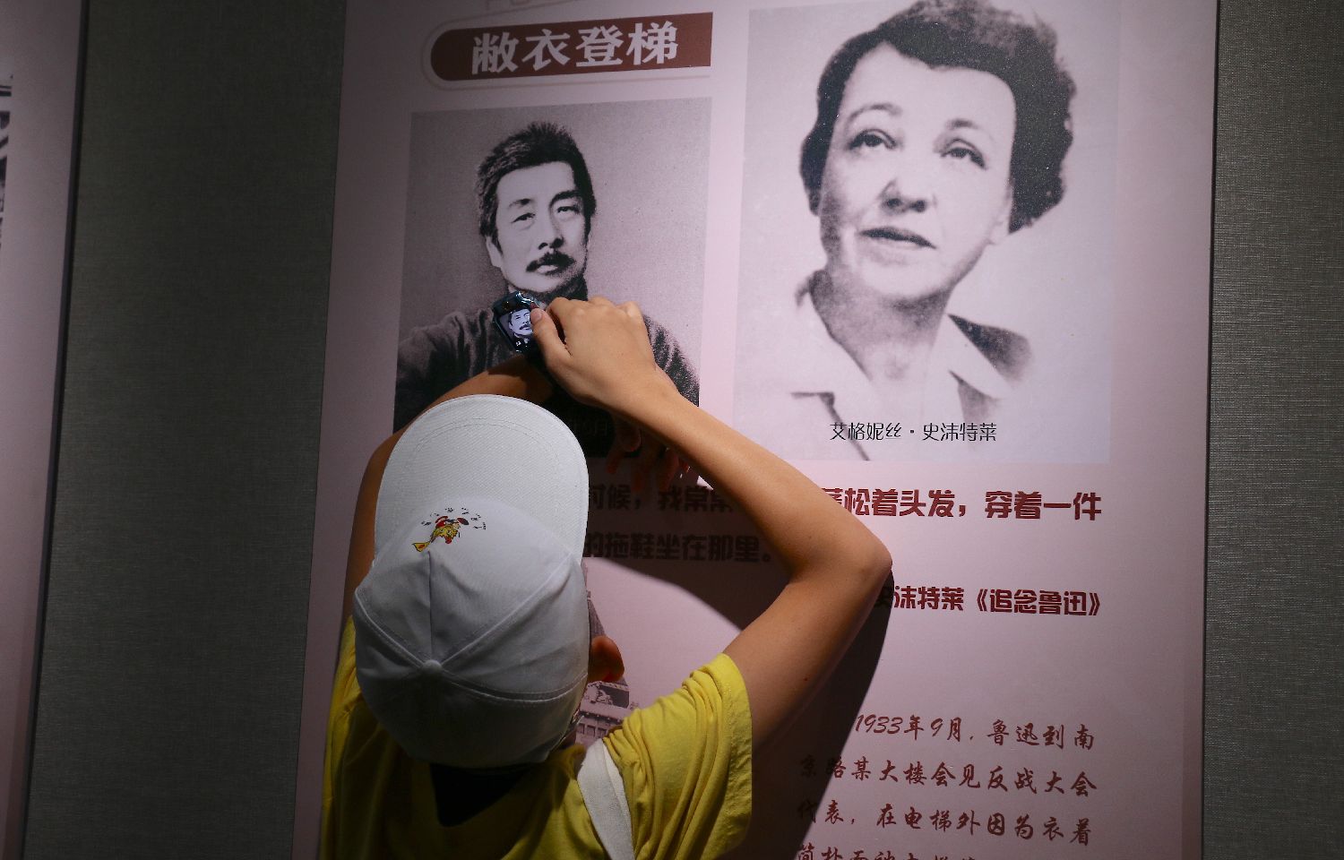 7月21日,华裔青少年用手表拍摄记录鲁迅画像。(图片来源:中新社)