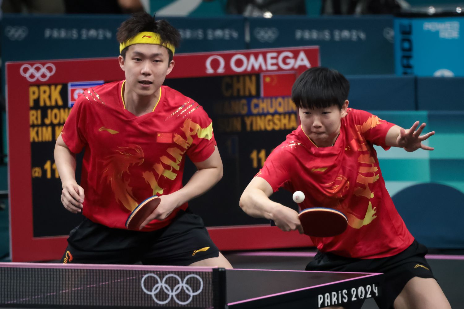 当地时间7月30日,在巴黎奥运会乒乓球混合双打决赛中,中国组合王楚钦/孙颖莎4-2战胜朝鲜组合,夺得金牌。(图片来源:香港中通社)
