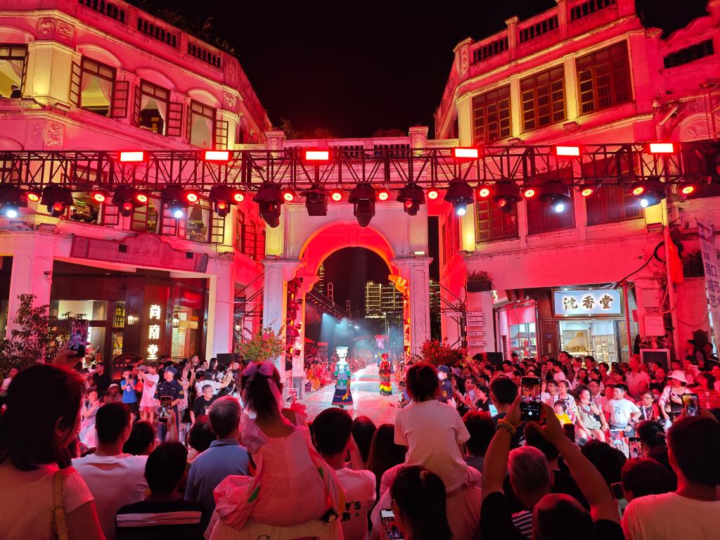 10月2日,游客在海南海口骑楼老街观看非遗潮秀。(图片来源:新华社)