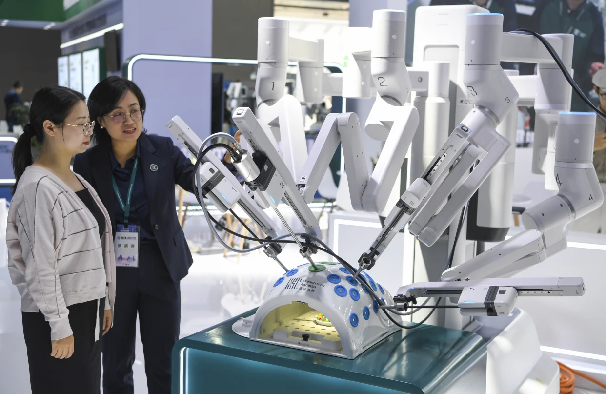 观众在2024中国医学装备展览会上参观手术机器人。(图片来源:新华社)