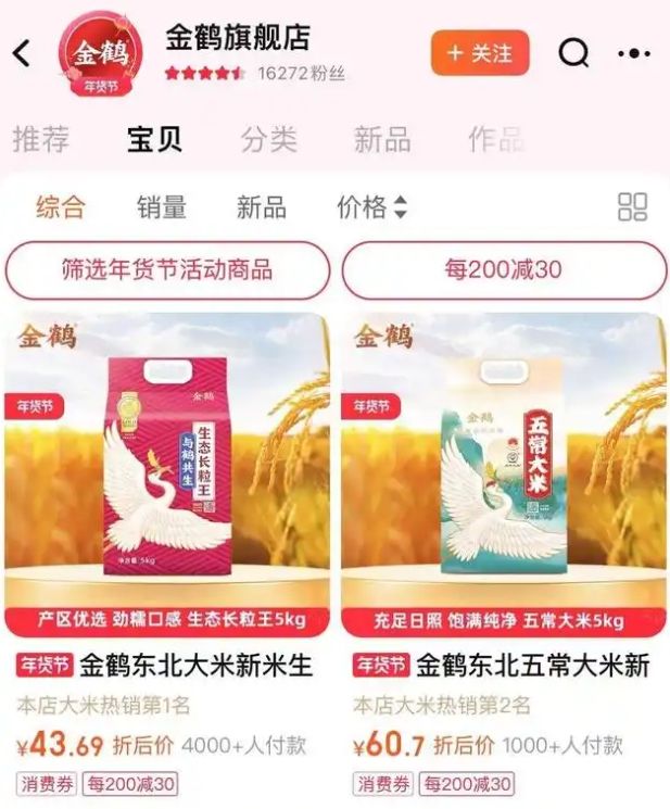 据报道,贵人鸟目前主营方向为大米加工销售和预制米饭,李志华计划未来将推出20种系列产品。2024年11月,“金鹤鲜食米饭”首款产品开始在抖音、小象超市等平台销售。但是现在在其网店搜索发现,鲜食米饭类产品销量远低于大米类产品。