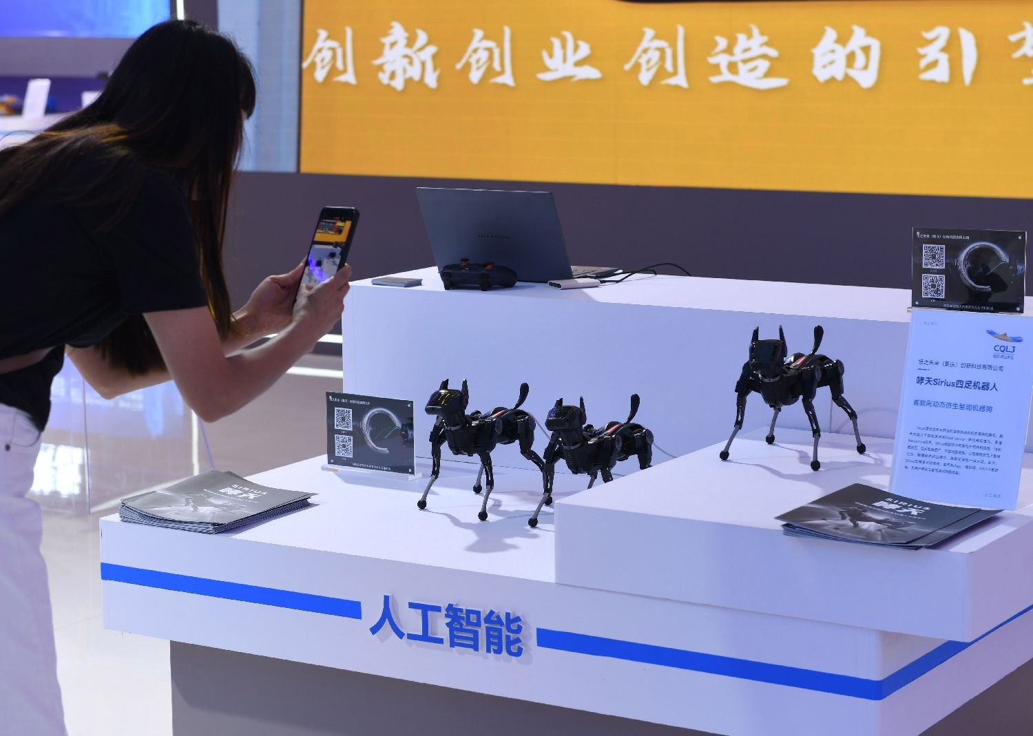 5月22日,第七届中国西部国际投资贸易洽谈会(简称西洽会)在重庆开幕。图为参展的小型智能四足机器人吸引观众拍照。(图片来源:中新社)