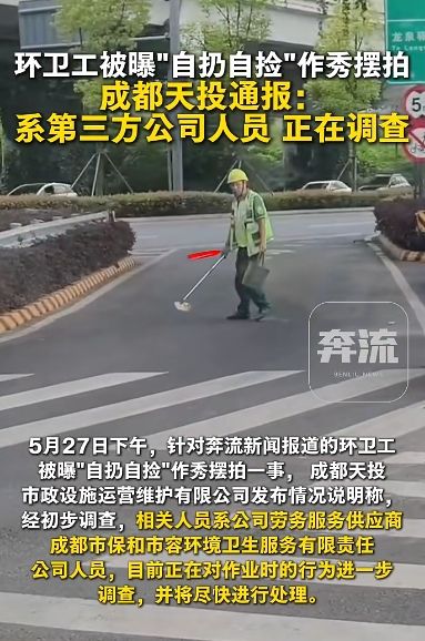 通报称:视频中涉事人员为成都天投市政设施运营维护有限公司劳务服务供应商——成都市保和市容环境卫生服务有限责任公司环卫工人成某及现场管理人员张某。该标段环卫作业面积约293万平方米,为实时反映现场作业质量及人员在岗情况,该公司要求项目管理人员采取照片拍摄的方式保留各路段工作过程及作业情况。