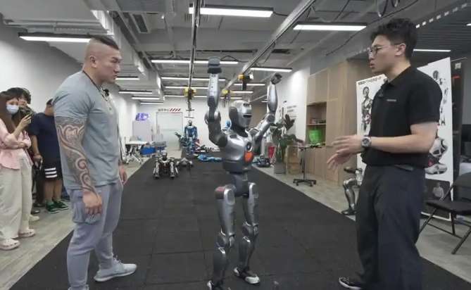 14日下午,“馆长”与众擎机器人互动。(图片来源:深圳直新闻客户端)