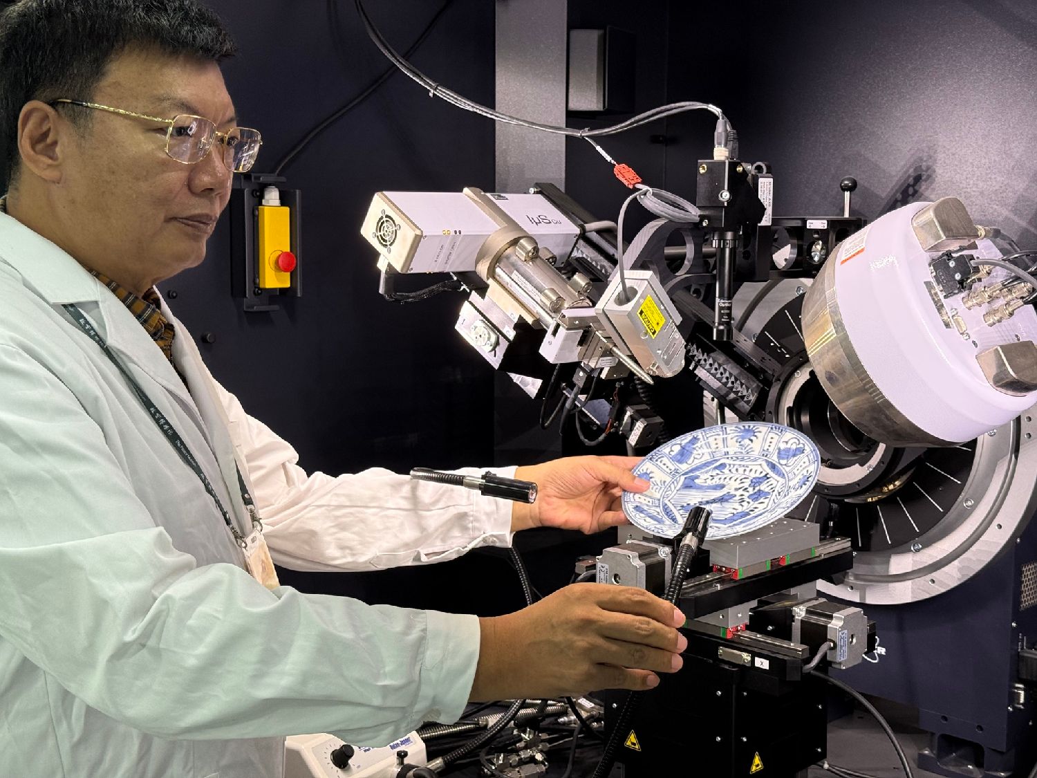 8月28日,“太和学者”项目首位港澳地区学者、澳门城市大学中国—葡萄牙文化遗产保护科学“一带一路”联合实验室博士赵强在故宫博物院文保科技部用仪器对克拉克瓷的釉面进行物相分析。(图片来源:中新社/受访者供图)