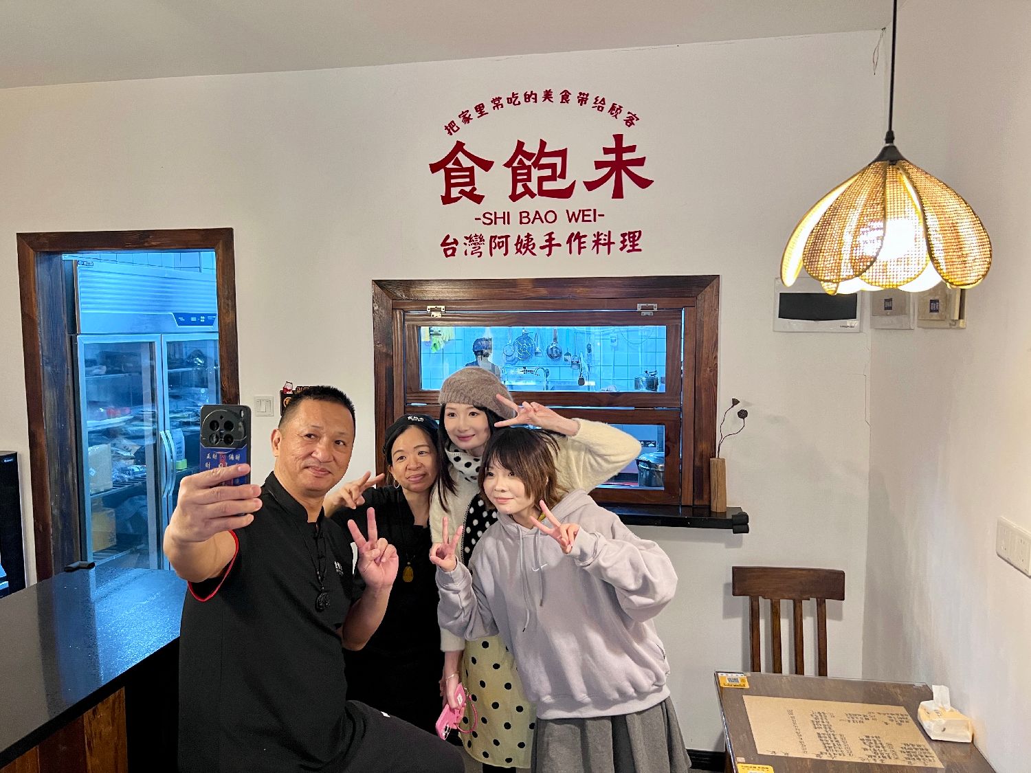 2025年12月,台湾餐饮人张有成(左一)与妻子(左二)和食客合影留念。(图片来源:中新社)