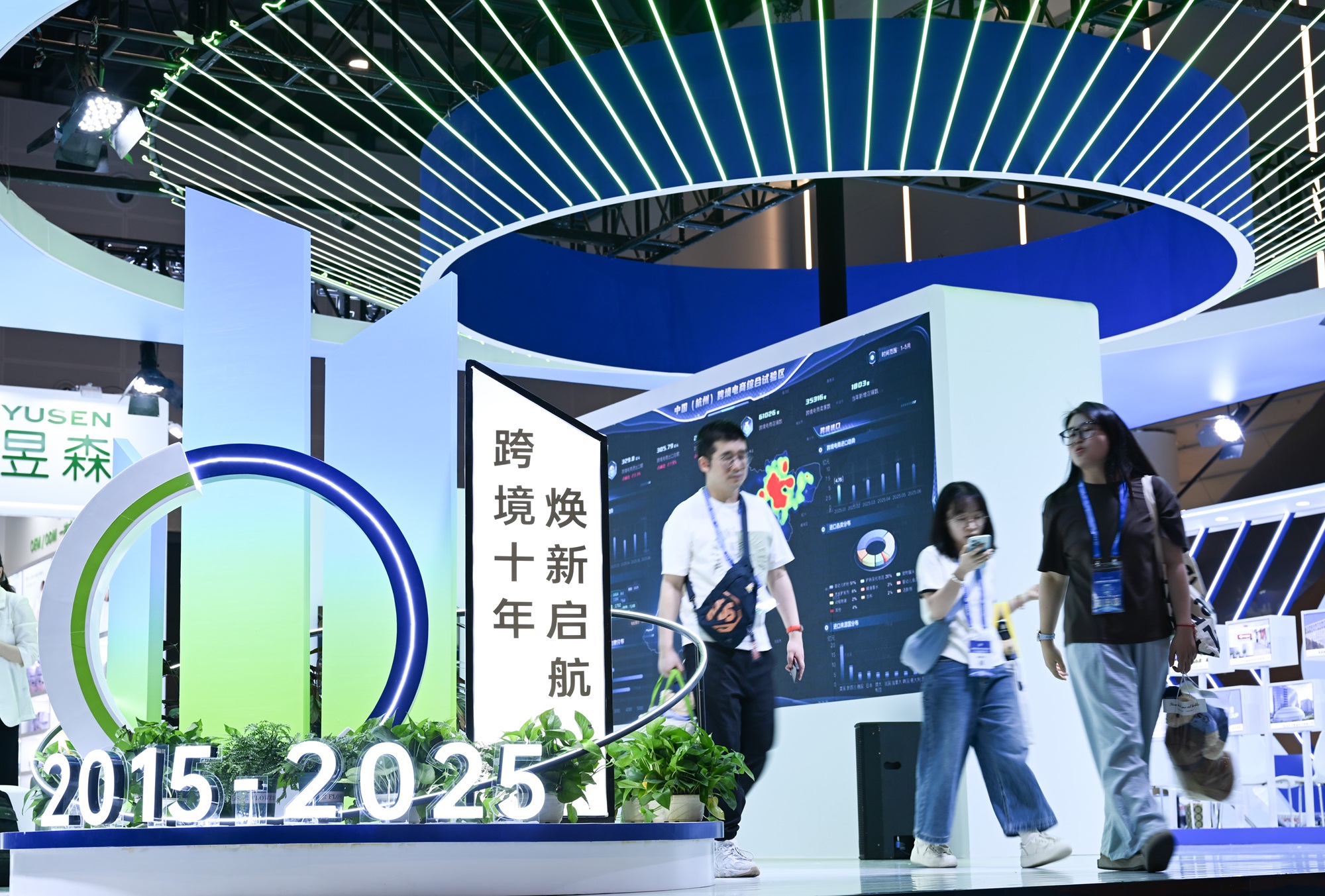 2025年7月10日,参观者在中国(杭州)跨境电商综合试验区展台交流。(图片来源:中新社)