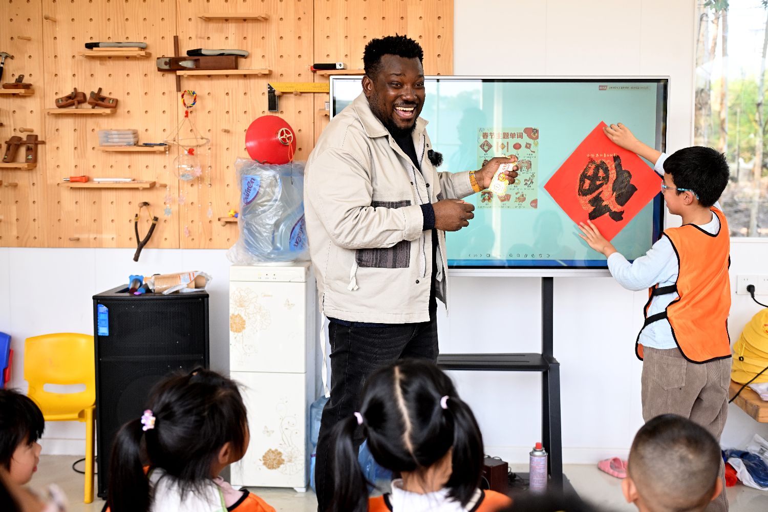 “春节”课堂现场,当珠峰拿起“福”字时,他用英文向孩子们介绍“福文化”,一位调皮的孩子踊跃上前互动,故意把“福”字倒过来,并大声说“福到啦!”此时,课堂欢声笑语不断……