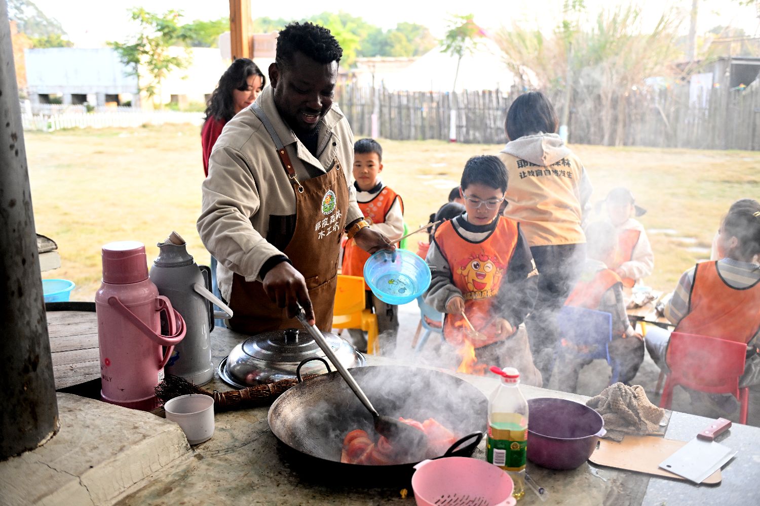 2月3日,“网红”青年外教珠峰(Joe)在福建省漳州市漳浦县的耶皮森林户外营地里,制作西红柿炒鸡蛋等中国美食。(图片来源:中新社)