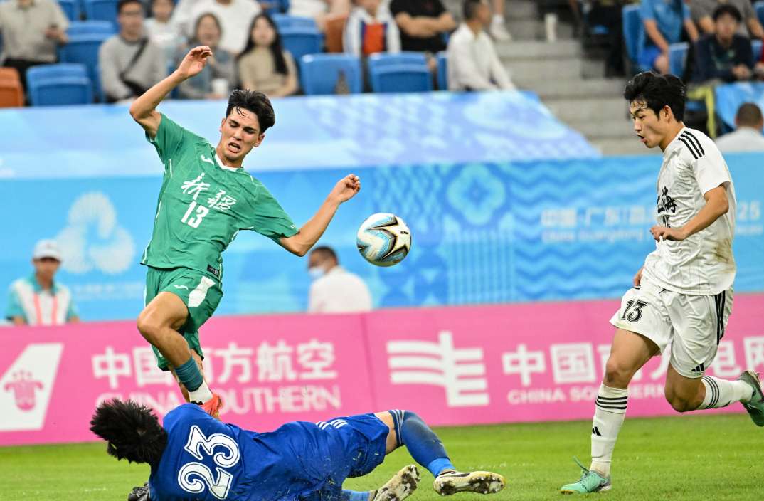 2025年11月8日,第十五届中国全国运动会男子20岁以下组1-8名交叉赛第2场比赛在深圳市体育中心体育场举行。图为新疆队球员布力格亚尔·库尔班江(绿衣)射门被扑。(图片来源:中新社)