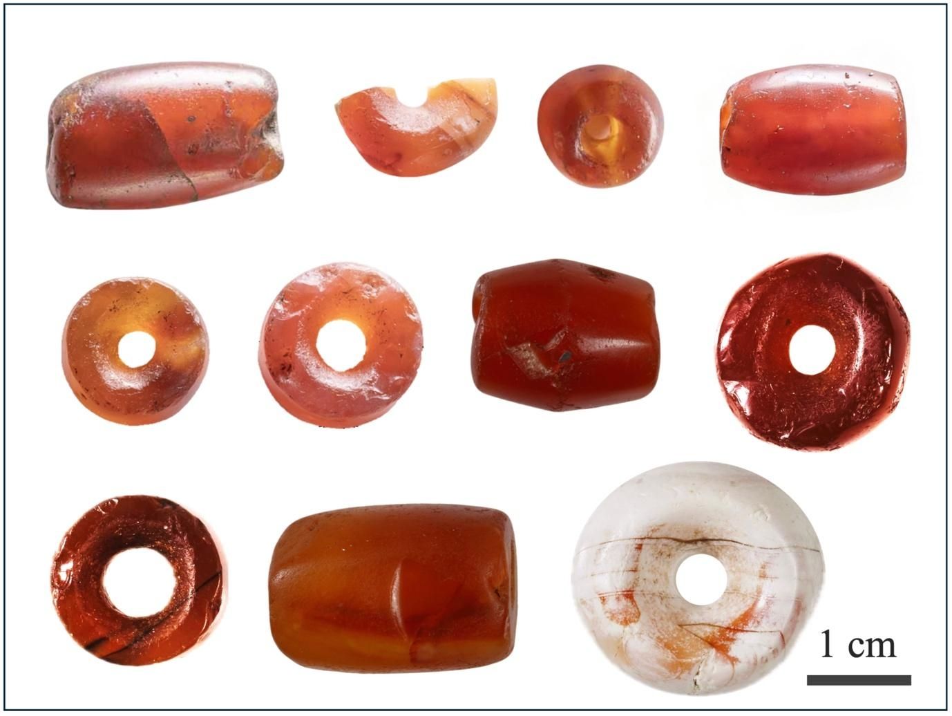 本项研究的三星堆祭祀坑出土11枚红玉髓珠。(图片来源:中新社/中国科学院地质地球所供图)