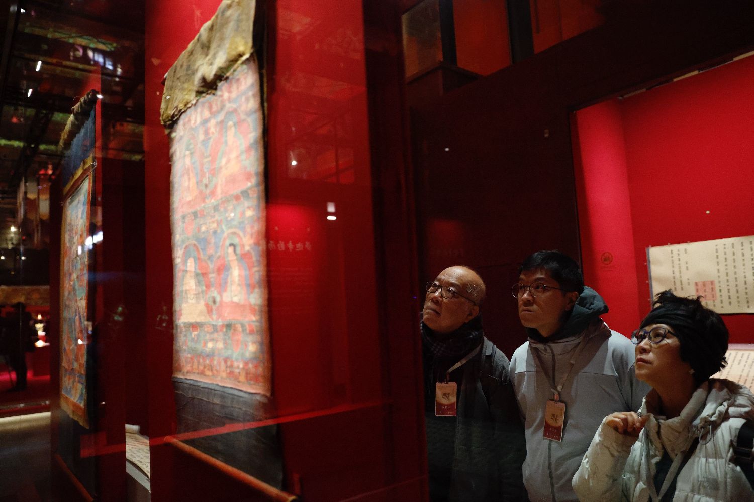 2月9日,由故宫博物院联合西藏自治区文物局等多家文博单位共同举办的“万法归一:萨迦寺历史文化与艺术”展在北京开幕。图为嘉宾参观展览。(图片来源:中新社)