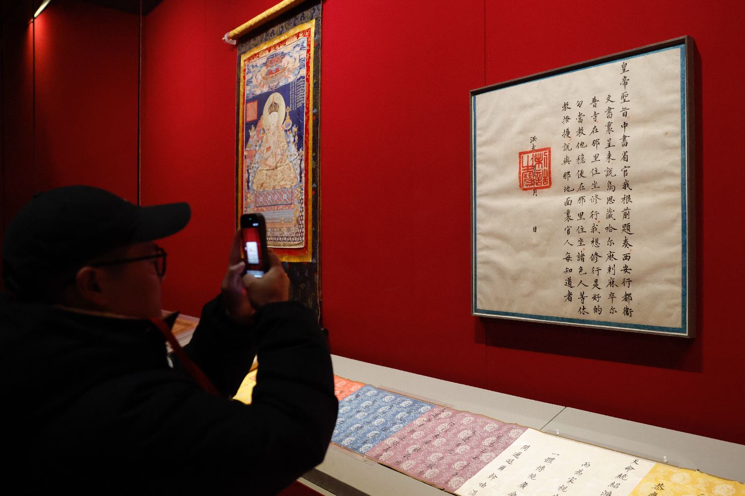 现场展出的《阔端敦请萨迦班智达令旨》《萨迦班智达致蕃人书》文献是说明“凉州会谈”后西藏地方成为元代中央所辖行政区域的重要政治文献。“大朝国师统领诸国僧尼中兴释教之印”是目前唯一能确认的八思巴用印,他少年时随叔父赴凉州,后深得忽必烈器重,被封国师、帝师,确立了藏传佛教在元代宫廷的尊崇地位;他创制八思巴文,推动西藏与中央政权的联结,并主持营建了萨迦南寺。