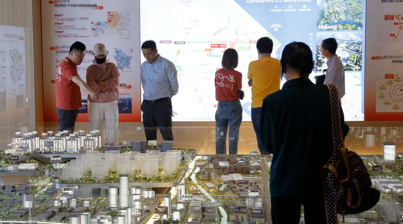 2024年6月4日,在上海市宝山区四季都会青藤里项目售楼处,民众观看楼盘信息。(图片来源:中新社资料图)
