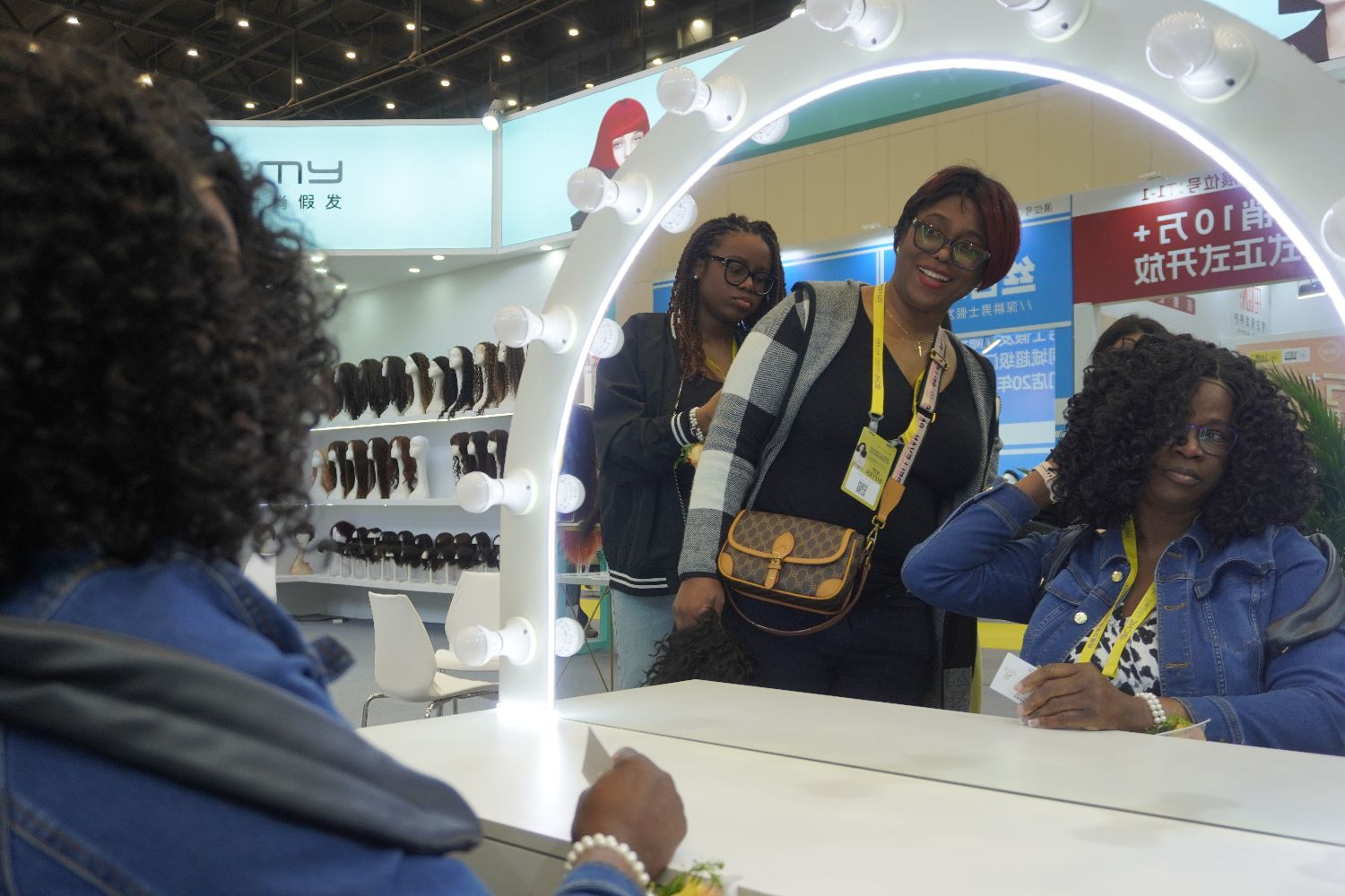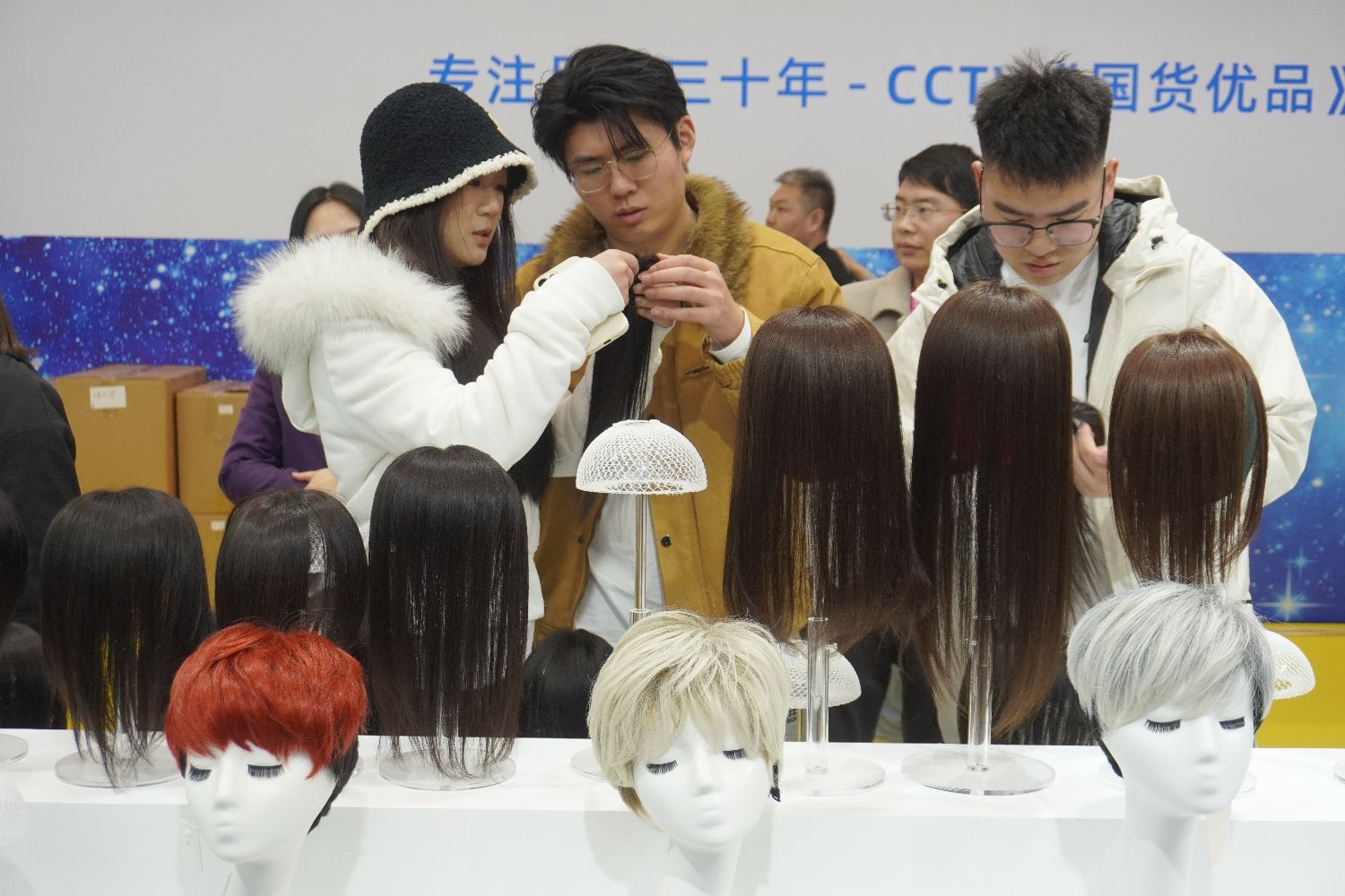 中新社报道,当日交易会现场,发套、发片、头模等产品琳琅满目。展商通过直播带货、假发发型设计等方式吸引客户,逛展客商则热衷试戴假发,体验百变造型。