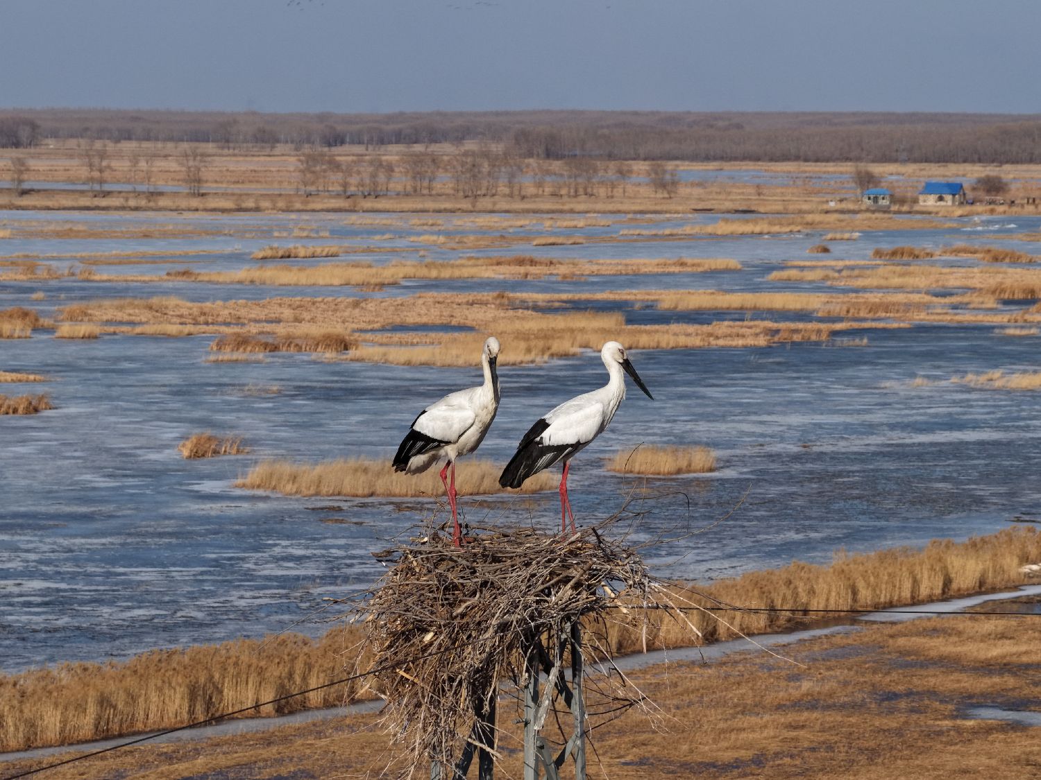 3月16日,吉林镇赉,一对东方白鹳在莫莫格湿地的巢中休憩。(图片来源:中新社)