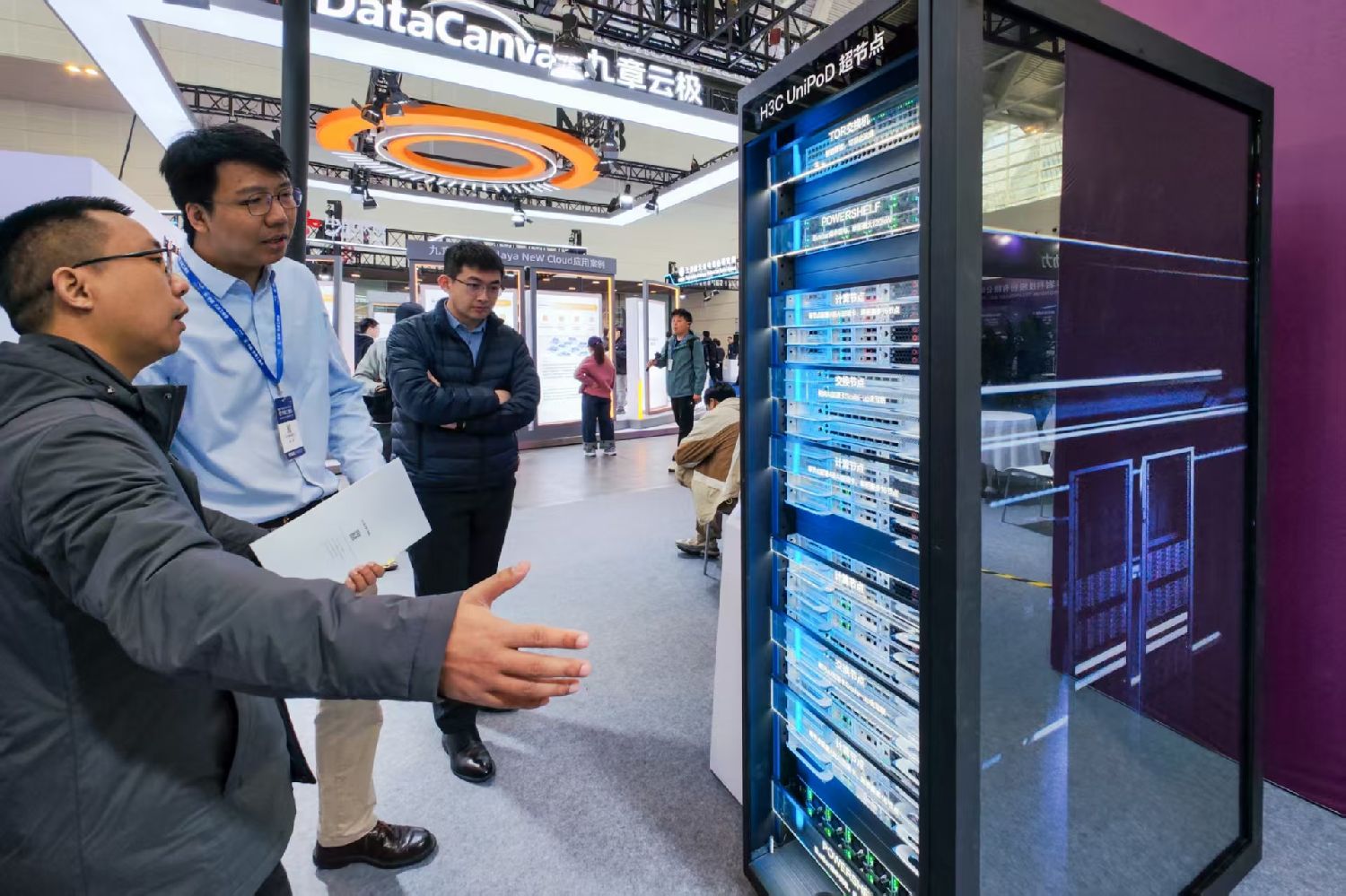 3月18日,天津,观众在首次设置的天津国际算力基础设施与应用展区参观超节点服务器。当日,第22届中国(天津)国际装备制造业博览会在国家会展中心(天津)启幕。(图片来源:中新社)