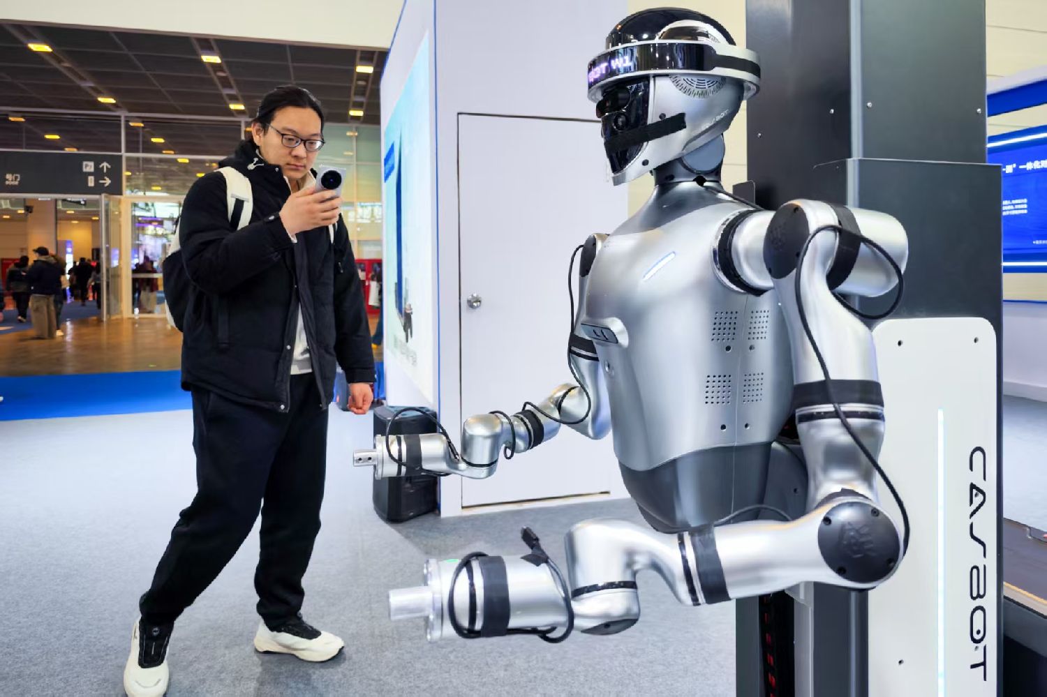 3月18日,天津,观众参观人形机器人。当日,第22届中国(天津)国际装备制造业博览会在国家会展中心(天津)启幕。(图片来源:中新社)