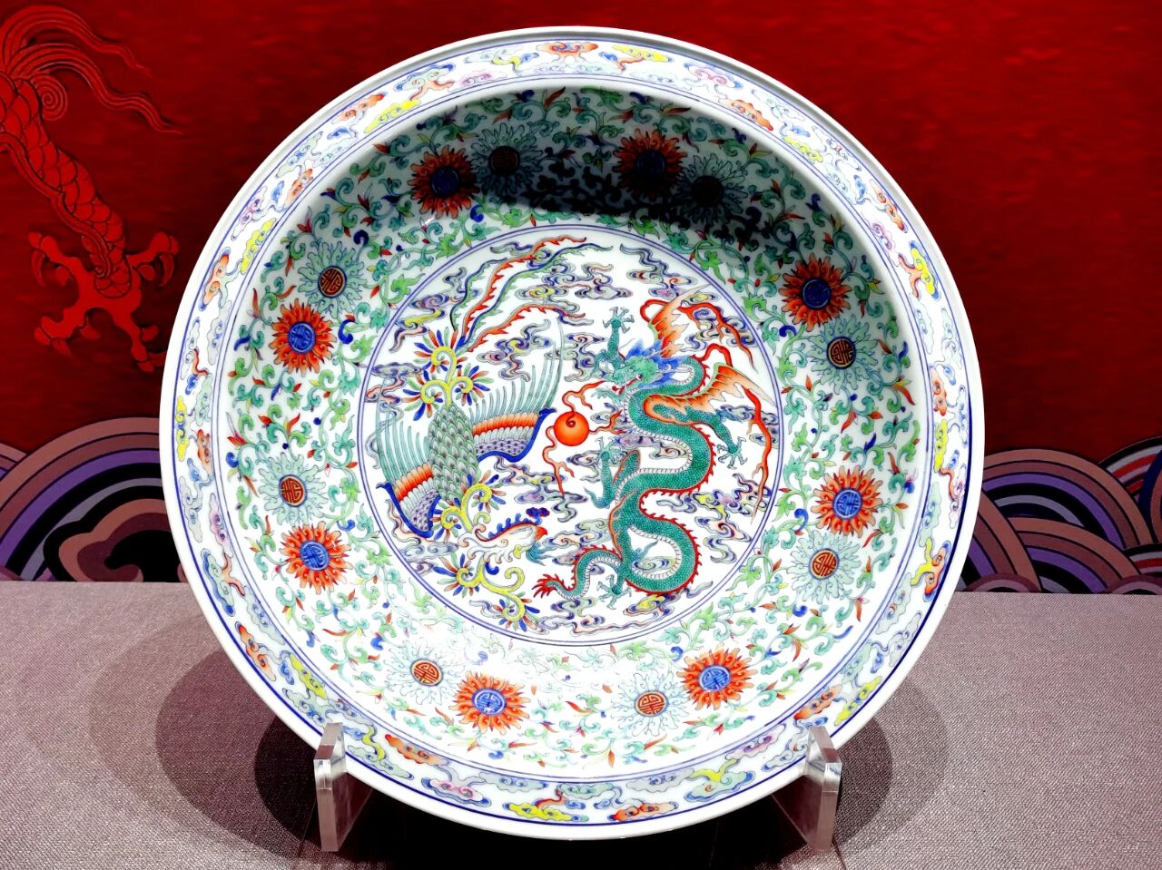 图为沈阳故宫博物院藏清雍正斗彩龙凤纹大盘。(图片来源:中新社/沈阳故宫博物院供图)