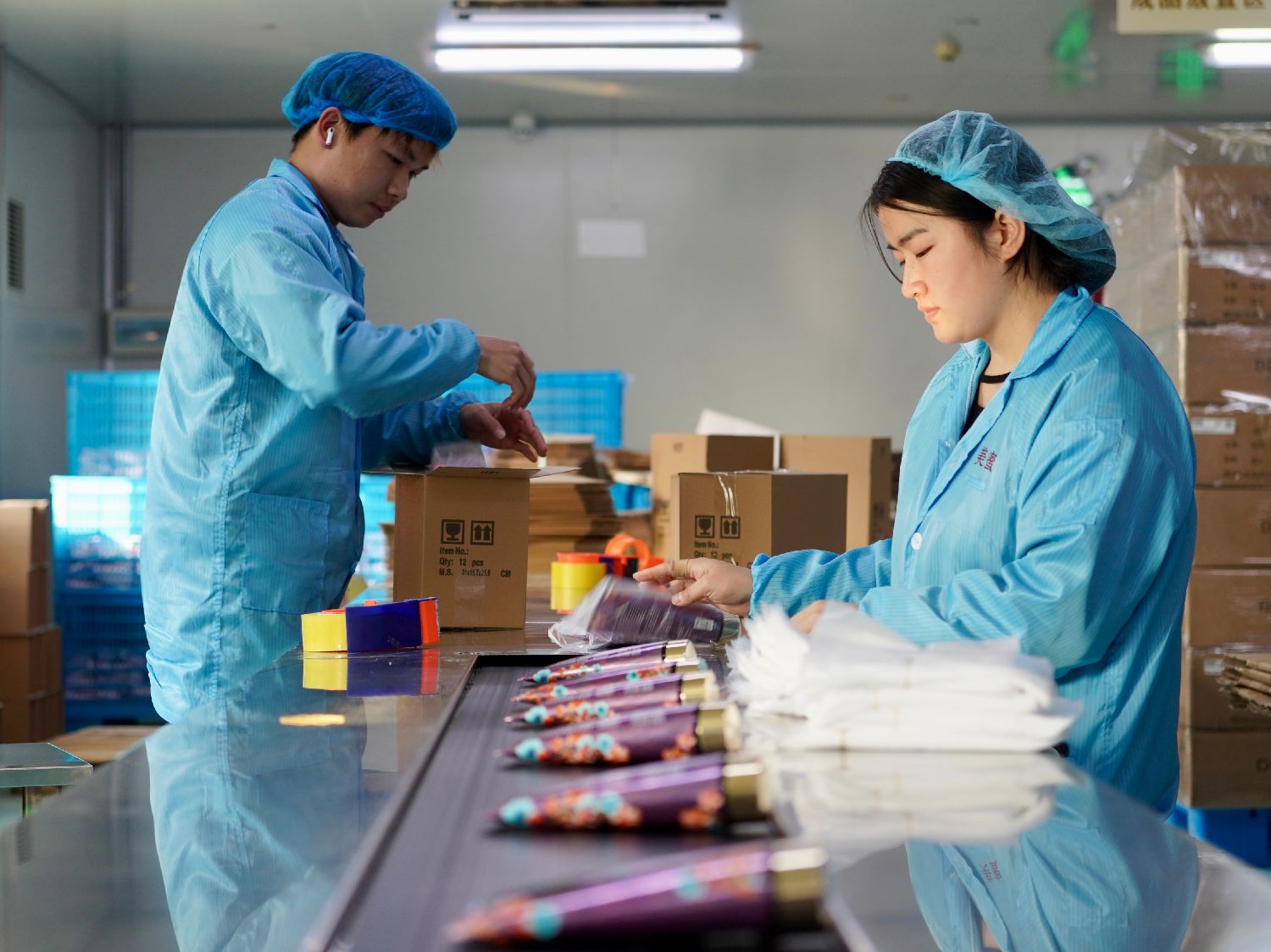 浙江义乌被中国轻工业联合会授予“中国化妆品(彩妆)基地”称号。图为2024年4月9日,流水线工作人员检查彩妆产品外观。(图片来源:中新社)