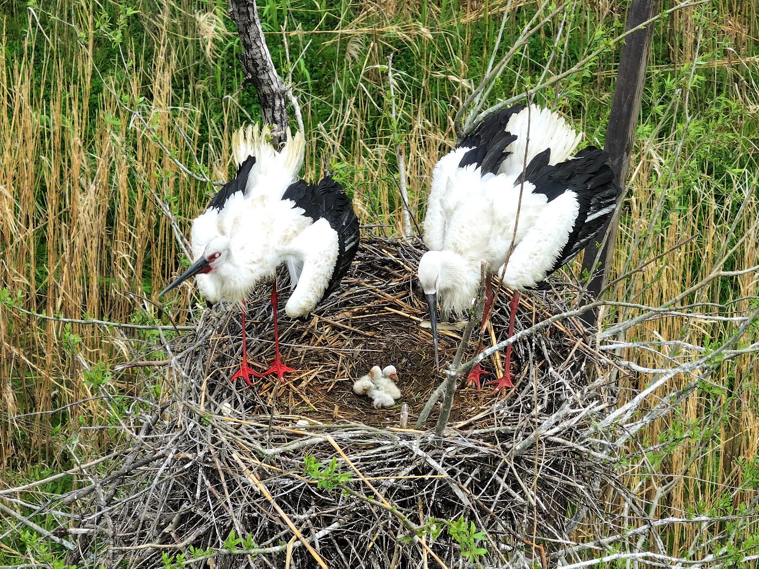 3月18日,南洞庭湖自然保护区舵杆洲区域,东方白鹳孵化出三只幼鸟。(图片来源:中新社)