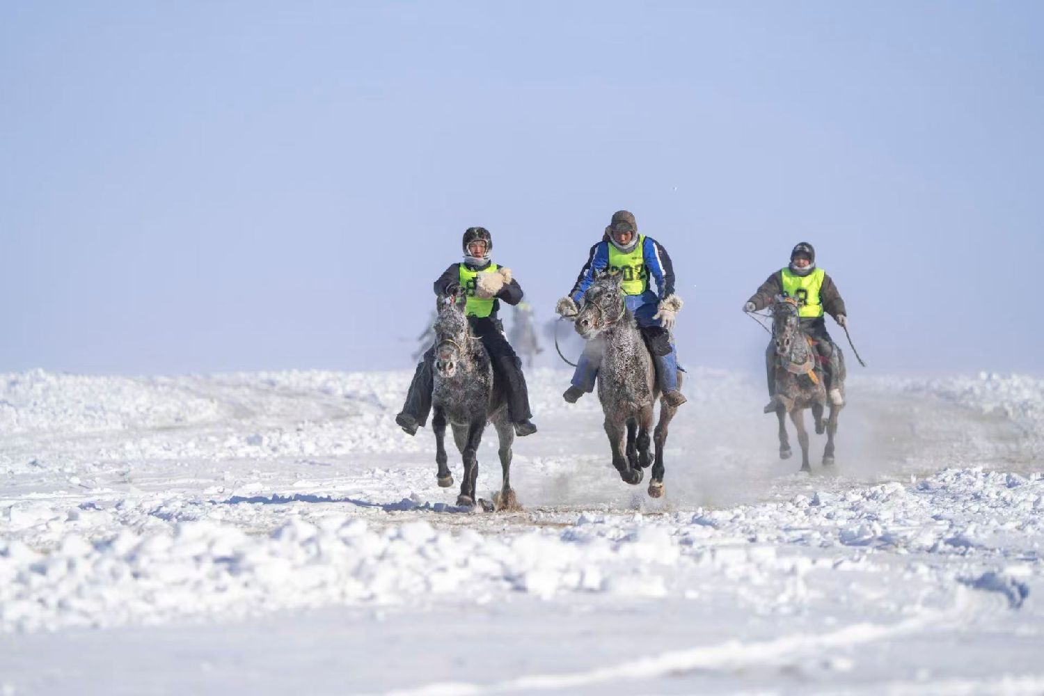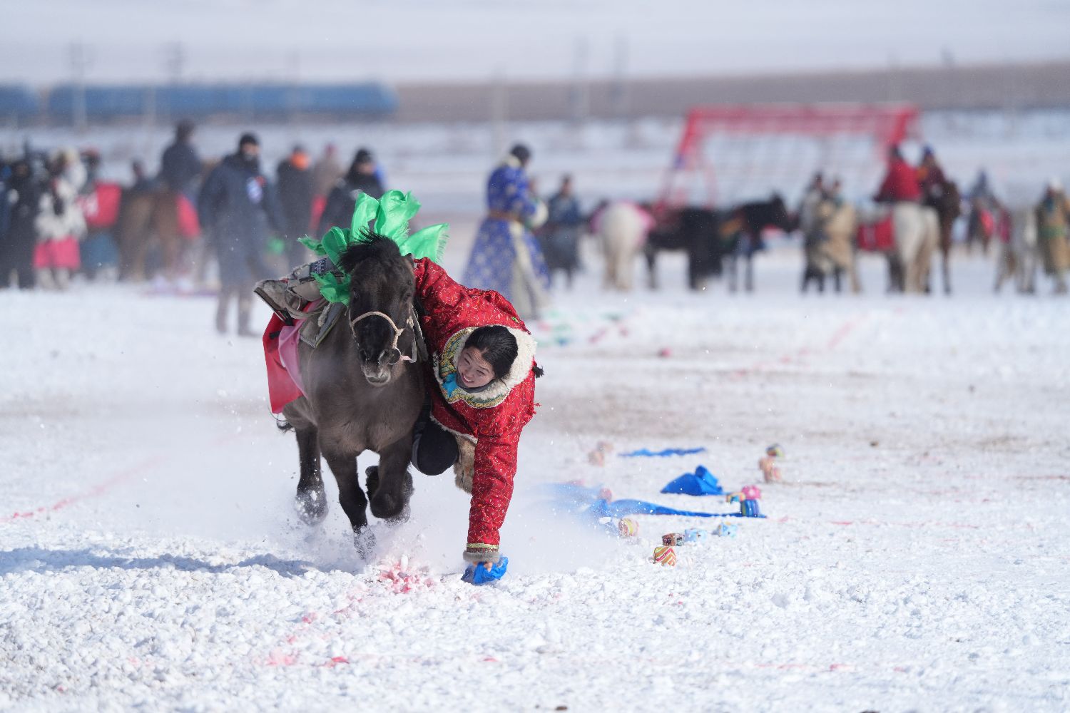 2月1日,内蒙古锡林浩特市,锡林郭勒盟第三届冬季蒙古马超级联赛总决赛—跑马拾哈达比赛现场。(图片来源:中新社)