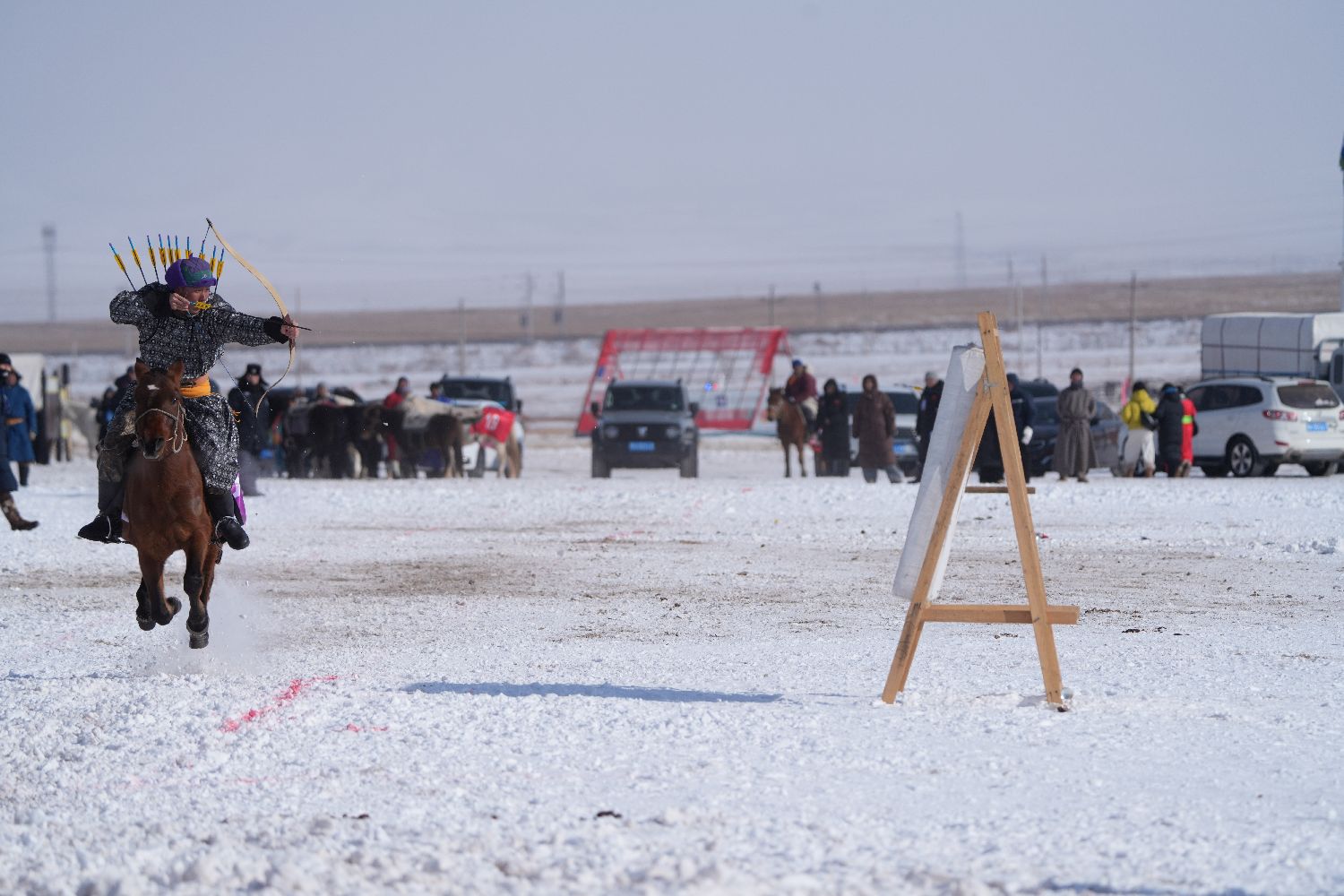 2月1日,内蒙古锡林浩特市,锡林郭勒盟第三届冬季蒙古马超级联赛总决赛—跑马射箭比赛现场。(图片来源:中新社)