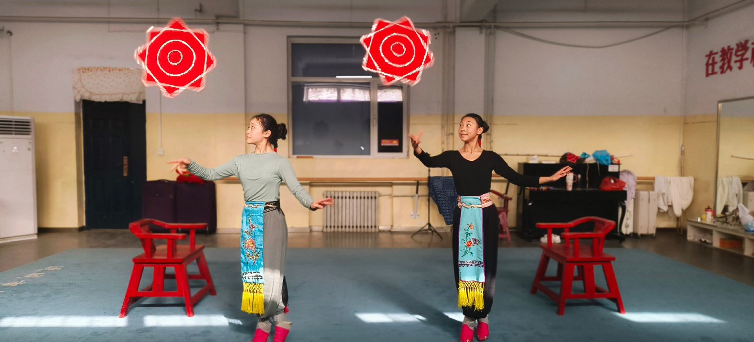 2026年3月,山西运城,14岁的张艳兰(右)与武奕汐练习《挂画》。(图片来源:中新社)