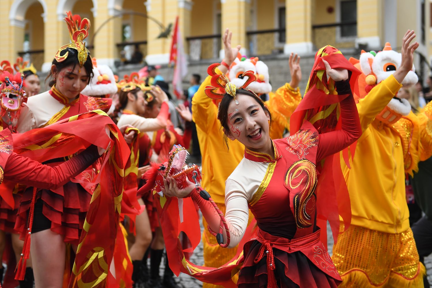 中新社报道,29日15时整,随着主持人倒数结束,近1600名身着各式服装的表演者从澳门大三巴牌坊前陆续出发,载歌载舞走进围观的“人海”中,沿着卖草地街、板樟堂前地一路向议事亭前地行进。