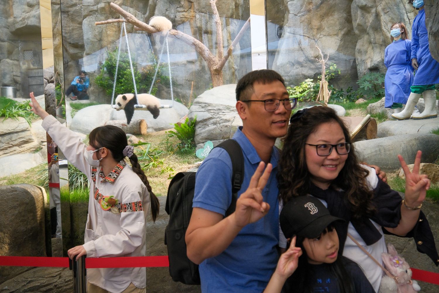 图为游客在香港海洋公园与大熊猫合照。(图片来源:中新社)