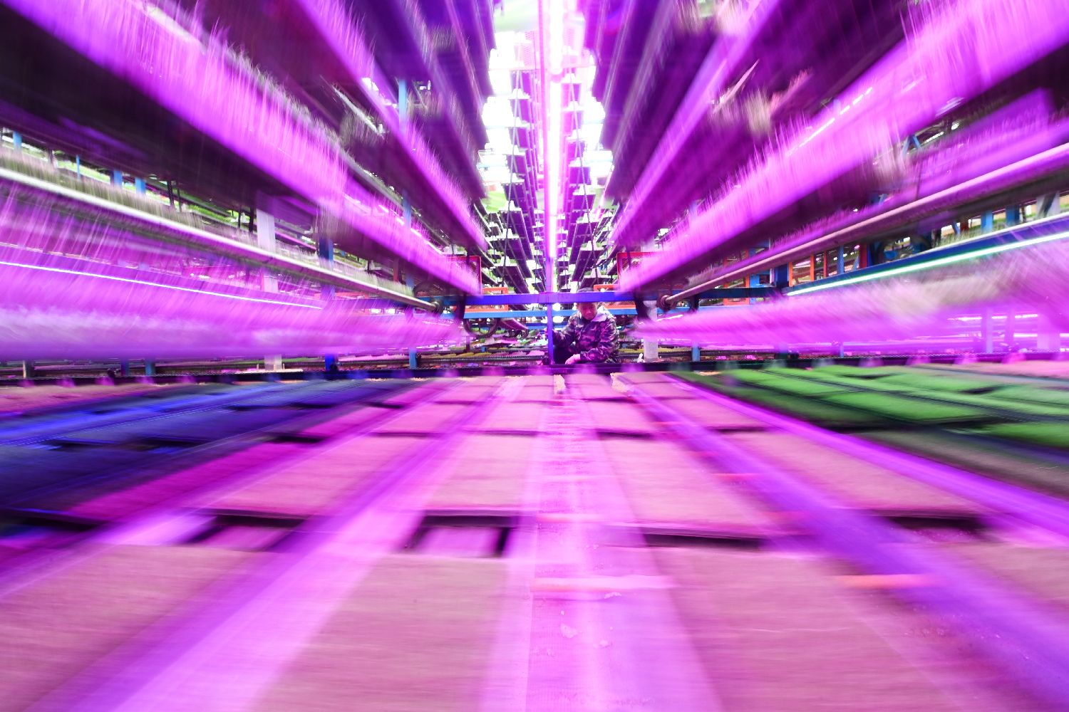 4月初,湖南长沙县春华镇智能化育秧工厂,紫红色的植物补光灯营造出科幻电影般的视觉冲击。(图片来源:中新社)