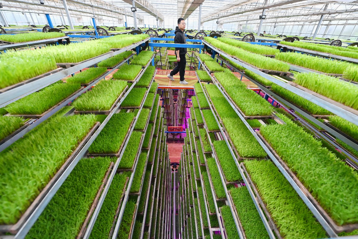 4月初,在湖南长沙县春华镇智能化育秧工厂,工作人员正在查看秧苗长势。(图片来源:中新社)