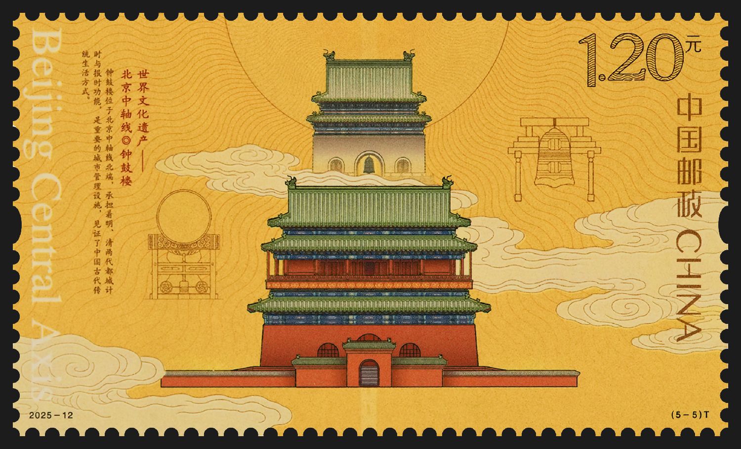 近日,2025年世界最佳邮票评选结果揭晓,图为此次获奖的《钟鼓楼》邮票。(图片来源:中新社/中国邮政供图)