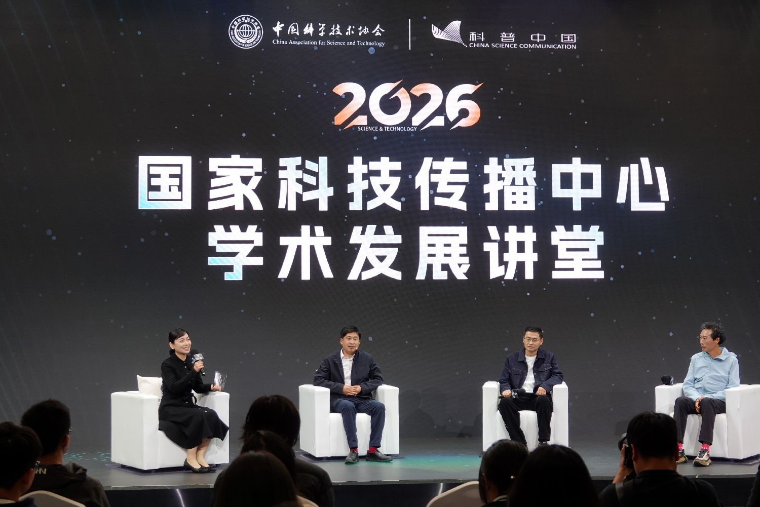 3月28日,国家科技传播中心学术发展讲堂射电天文技术专场录制现场的对谈环节。(图片来源:中新社)