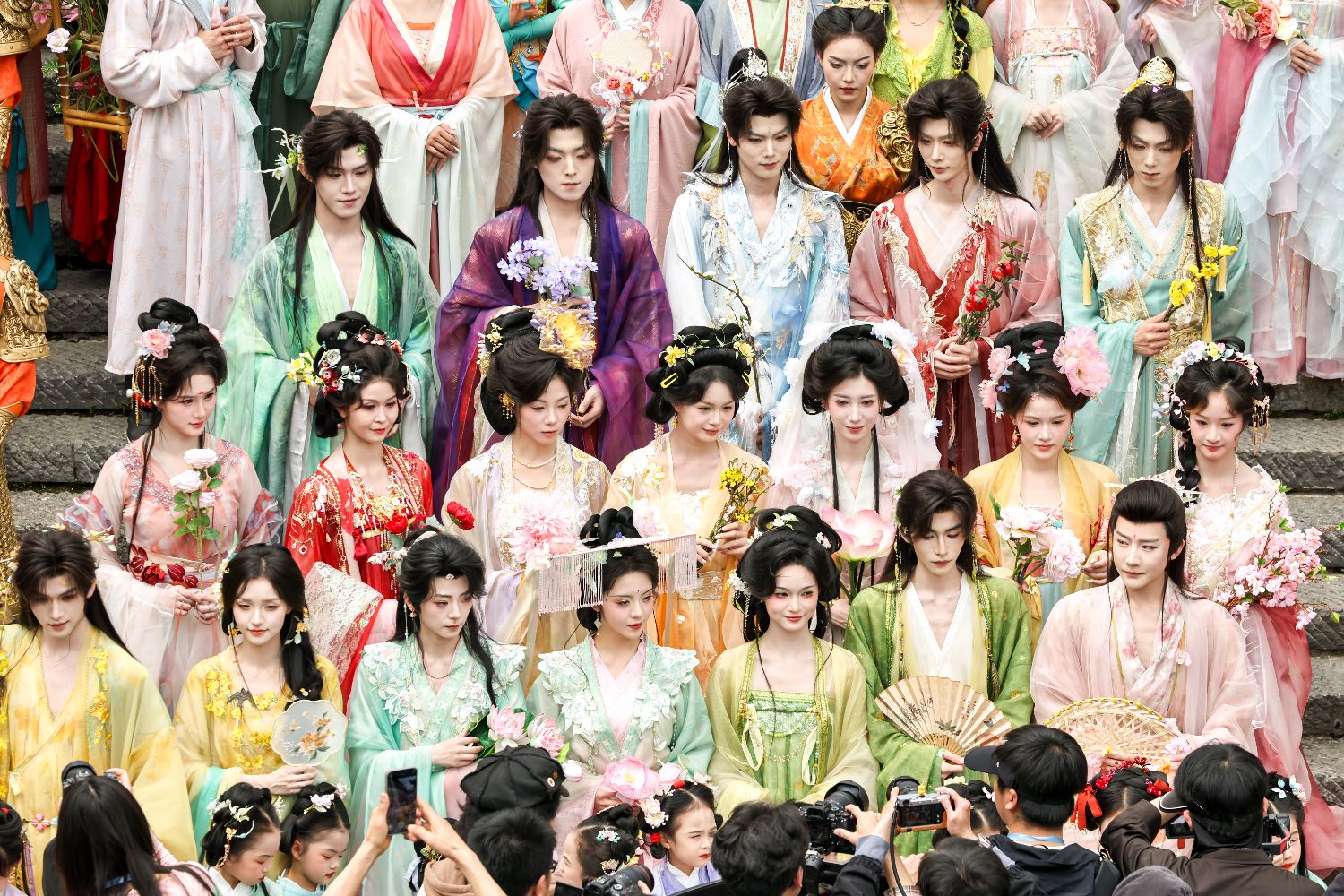 3月28日,湖北武汉,汉服爱好者巡游后合影。当日,第七届汉口里花朝节在武汉园博园正式启幕,现场开展祭花神、汉服巡游、古风展演及民俗体验等内容。(图片来源:中新社)
