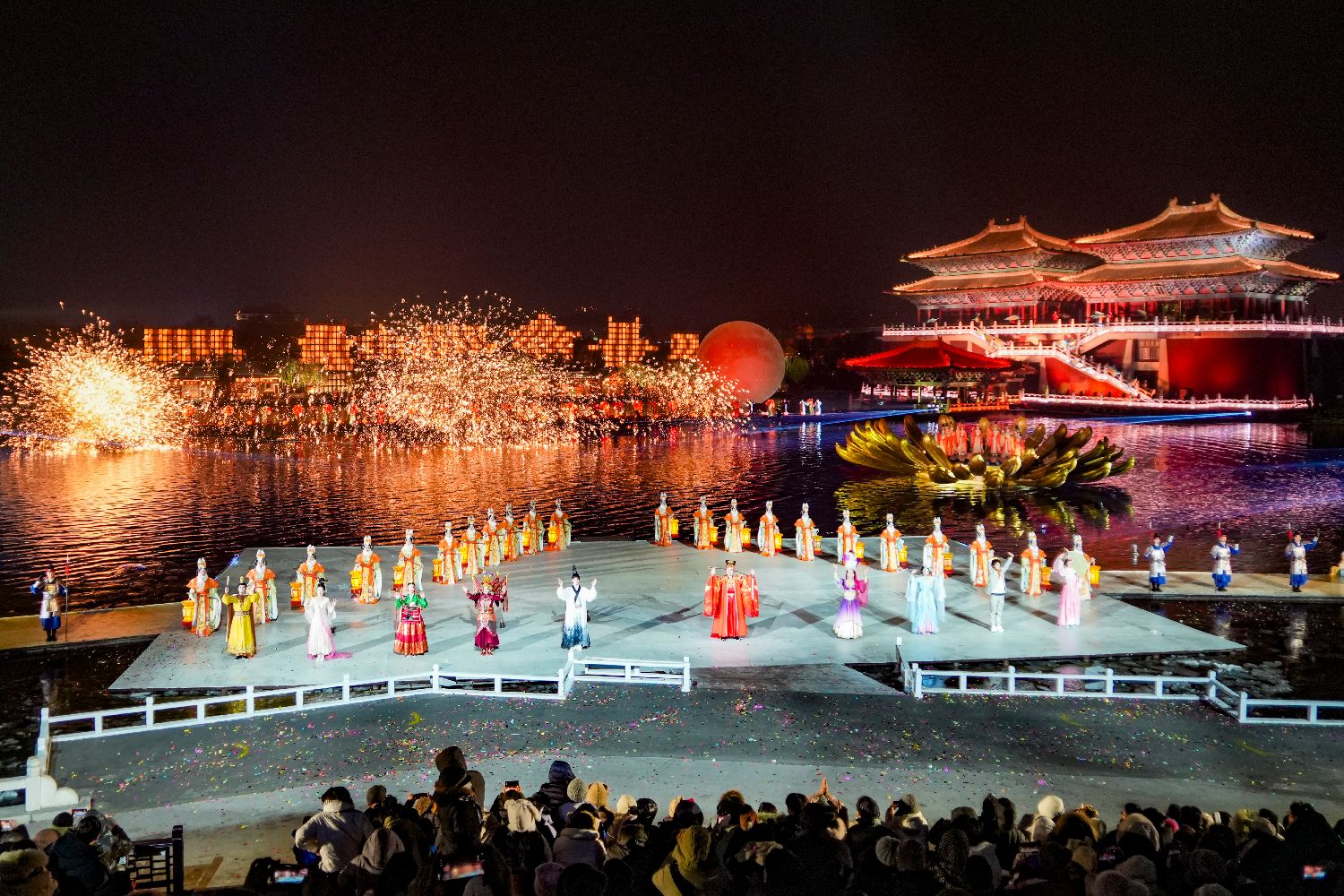 1月23日晚,河南开封,全新版实景演出《大宋·东京梦华》在清明上河园上演,呈现北宋汴京的繁华盛景。(图片来源:中新社)