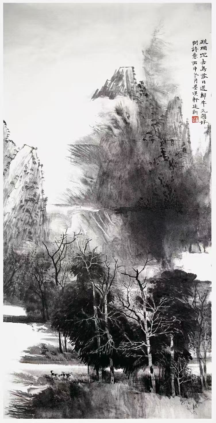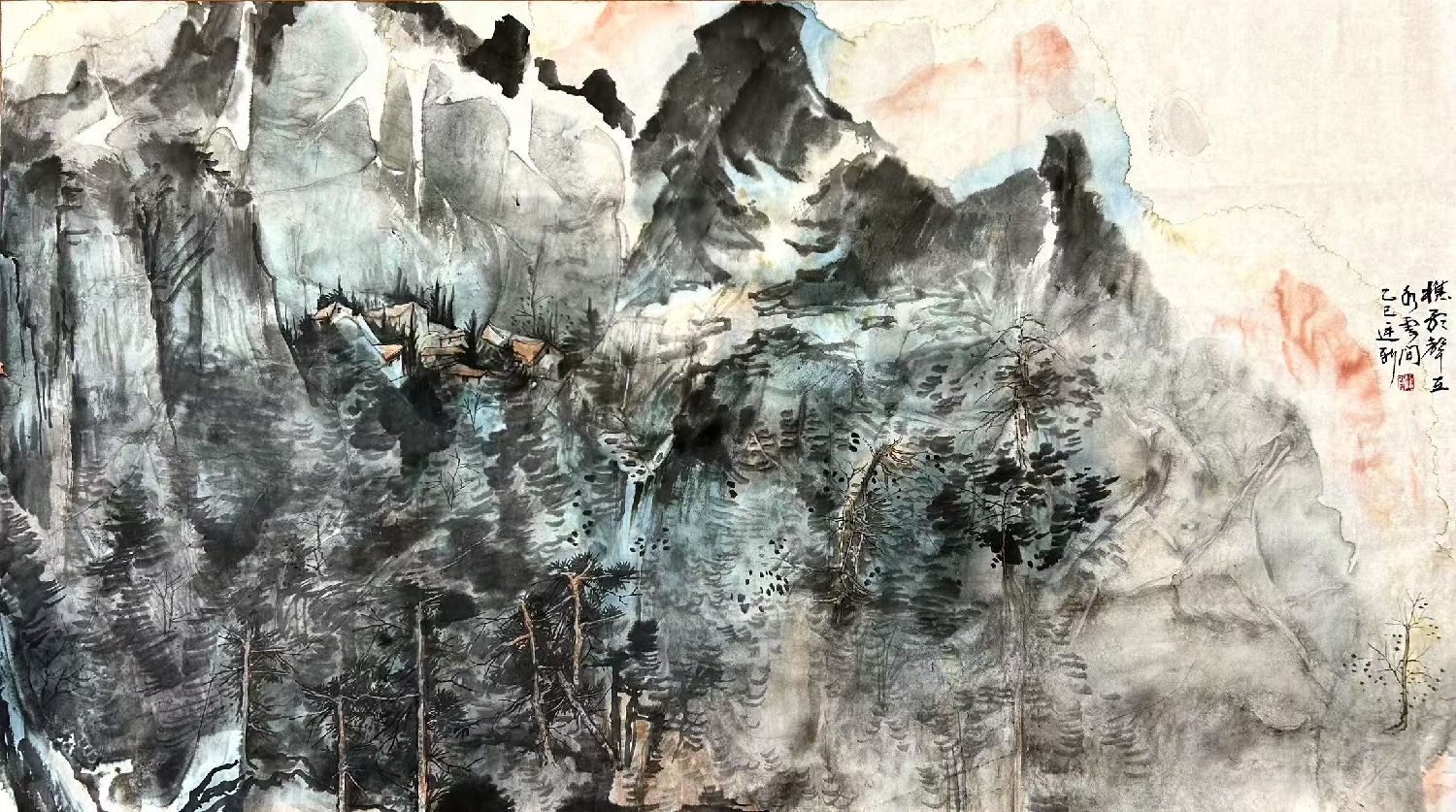 《鹿鸣谷》,以淡墨晕染表现加拿大溪谷的空灵,近景细腻刻画树木与房舍,展现悠然自得的山居生活。