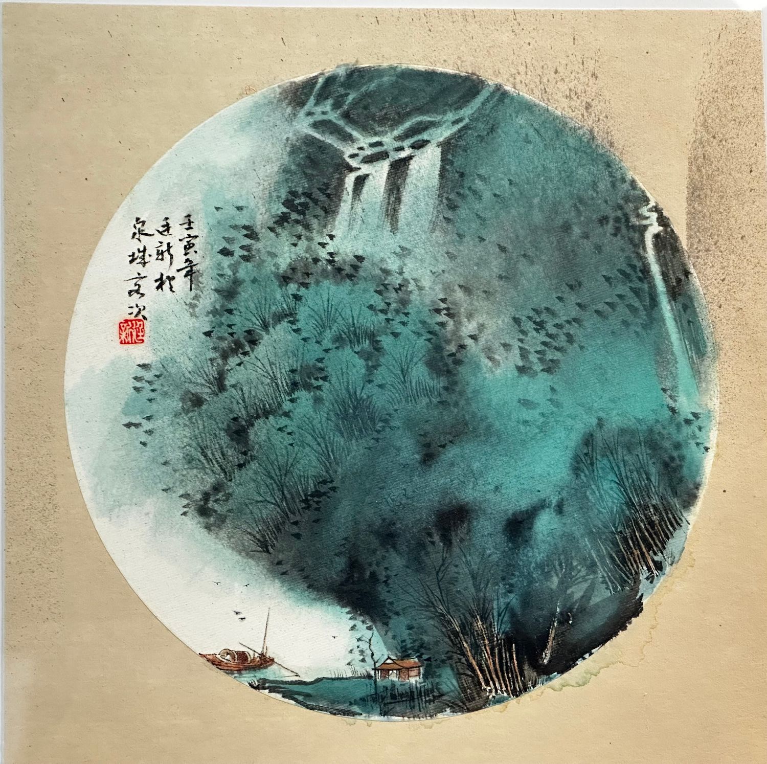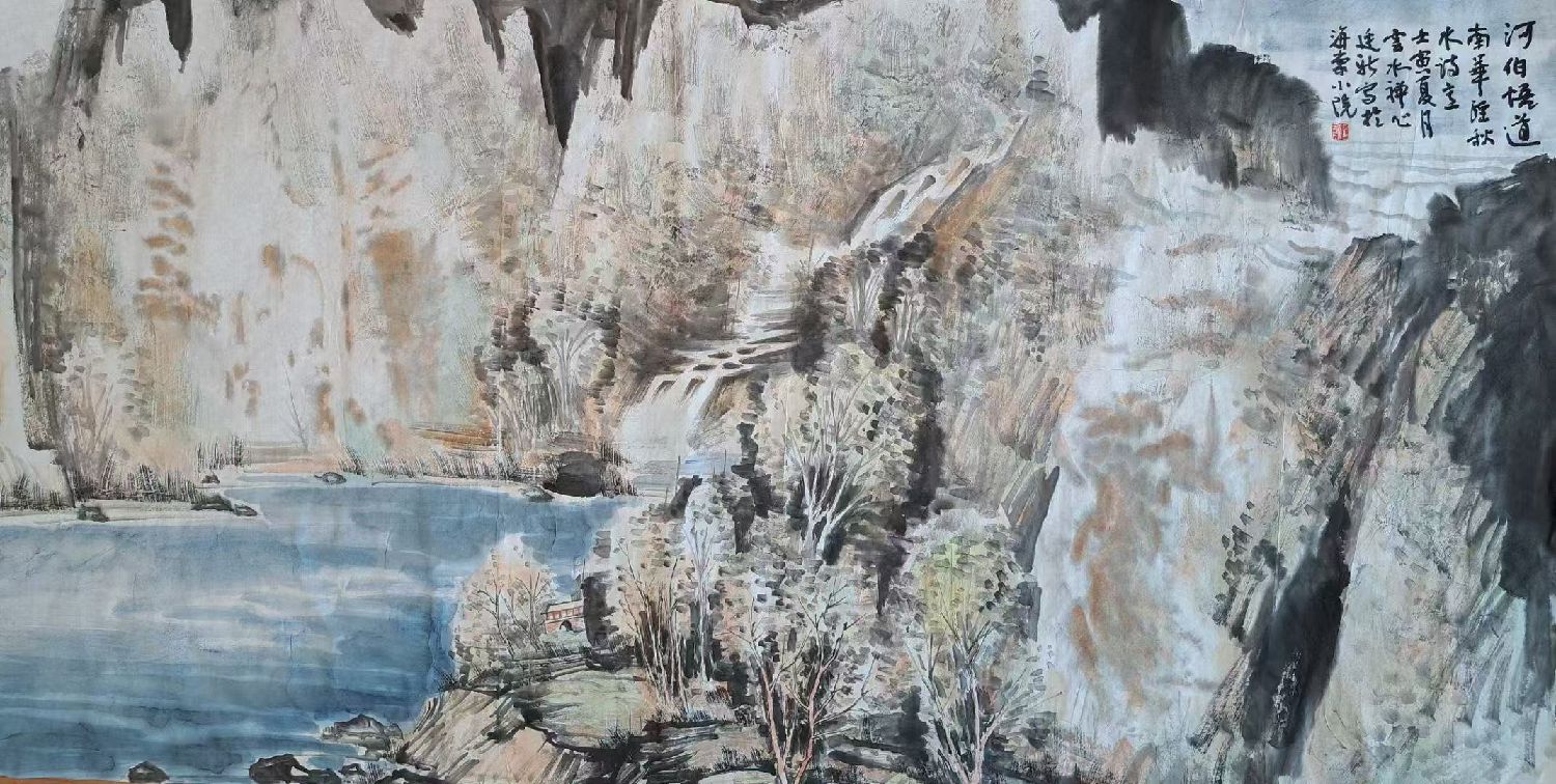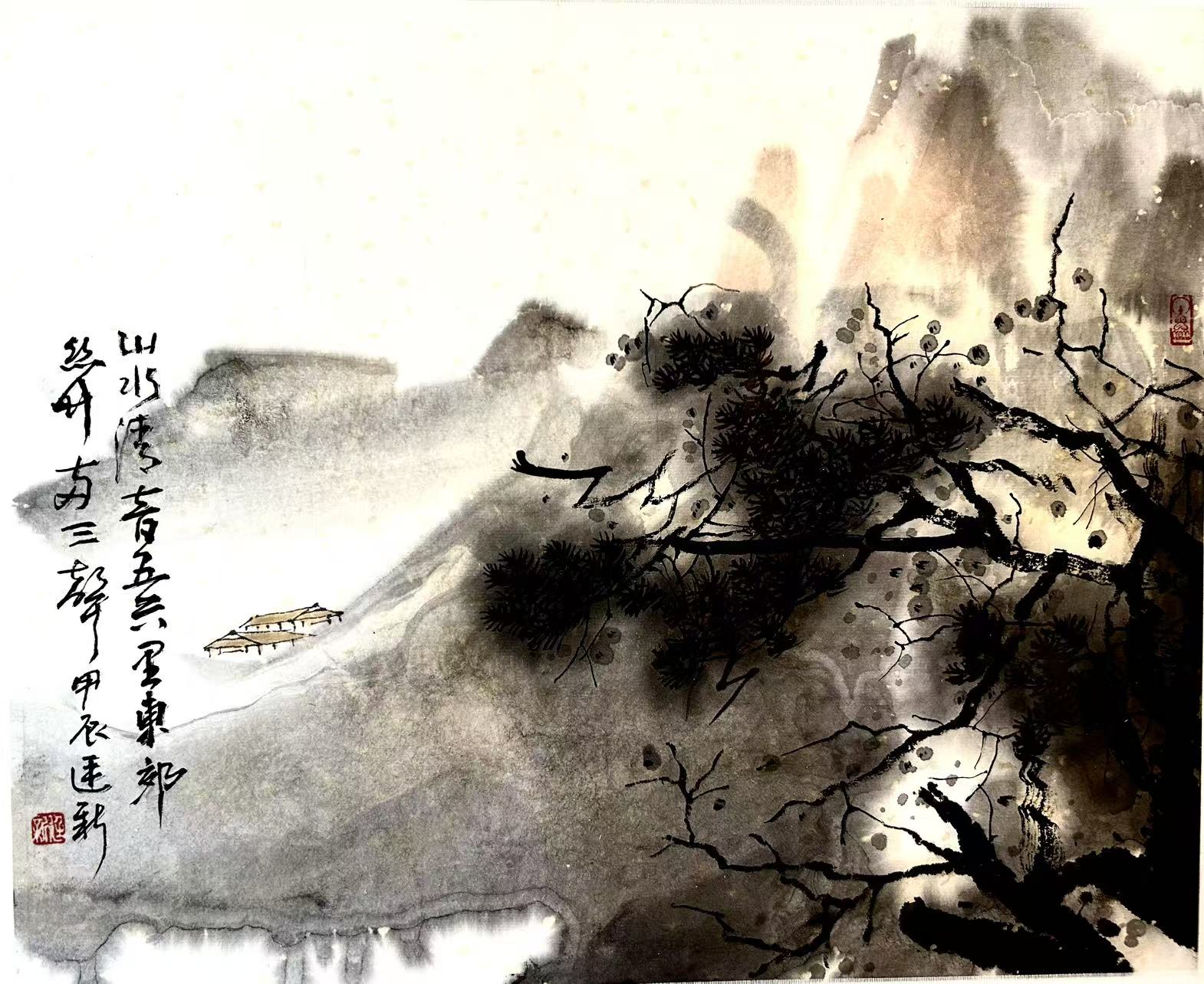 他的水墨画《山水清音》,以浓淡相间的墨色表现山峦的层次感,大笔触勾勒山体轮廓,厚重墨块展现山体质感,营造出雄浑壮阔的视觉效果,画面中群山巍峨,树木葱茏,瀑布飞流直下。作者以中锋勾勒山石轮廓,线条刚劲有力,如钢筋铁骨般支撑起画面的骨架,又以侧锋皴擦山石肌理,表现出山石的质感与立体感。墨色上,近处树木浓墨重彩,枝叶繁茂;远处山峦淡墨轻染,若隐若现,形成了鲜明的虚实对比。同时,作者在墨色中巧妙地融入了些许石青、石绿等矿物颜料,使画面在沉稳中透露出一丝灵动与清新,传统笔墨与现代色彩在此达到了完美的融合。