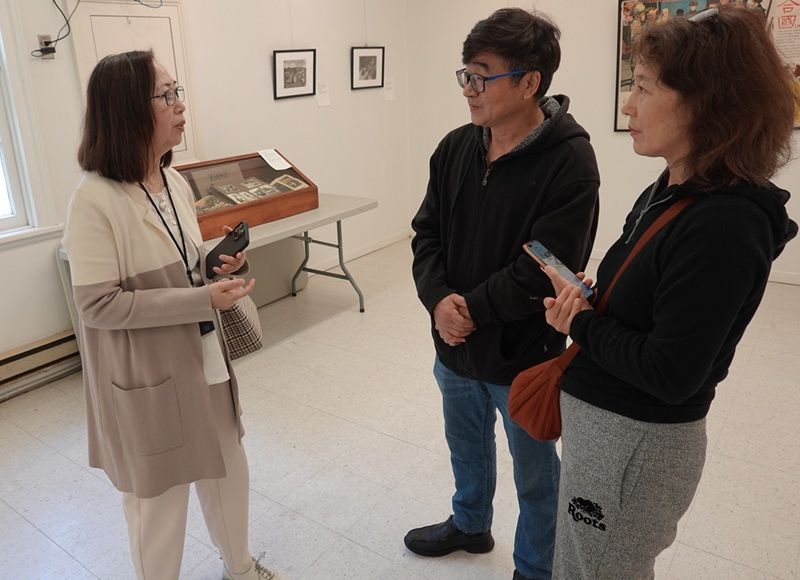 亚太和平博物馆的统筹策划刘美玲(左),接受记者采访。